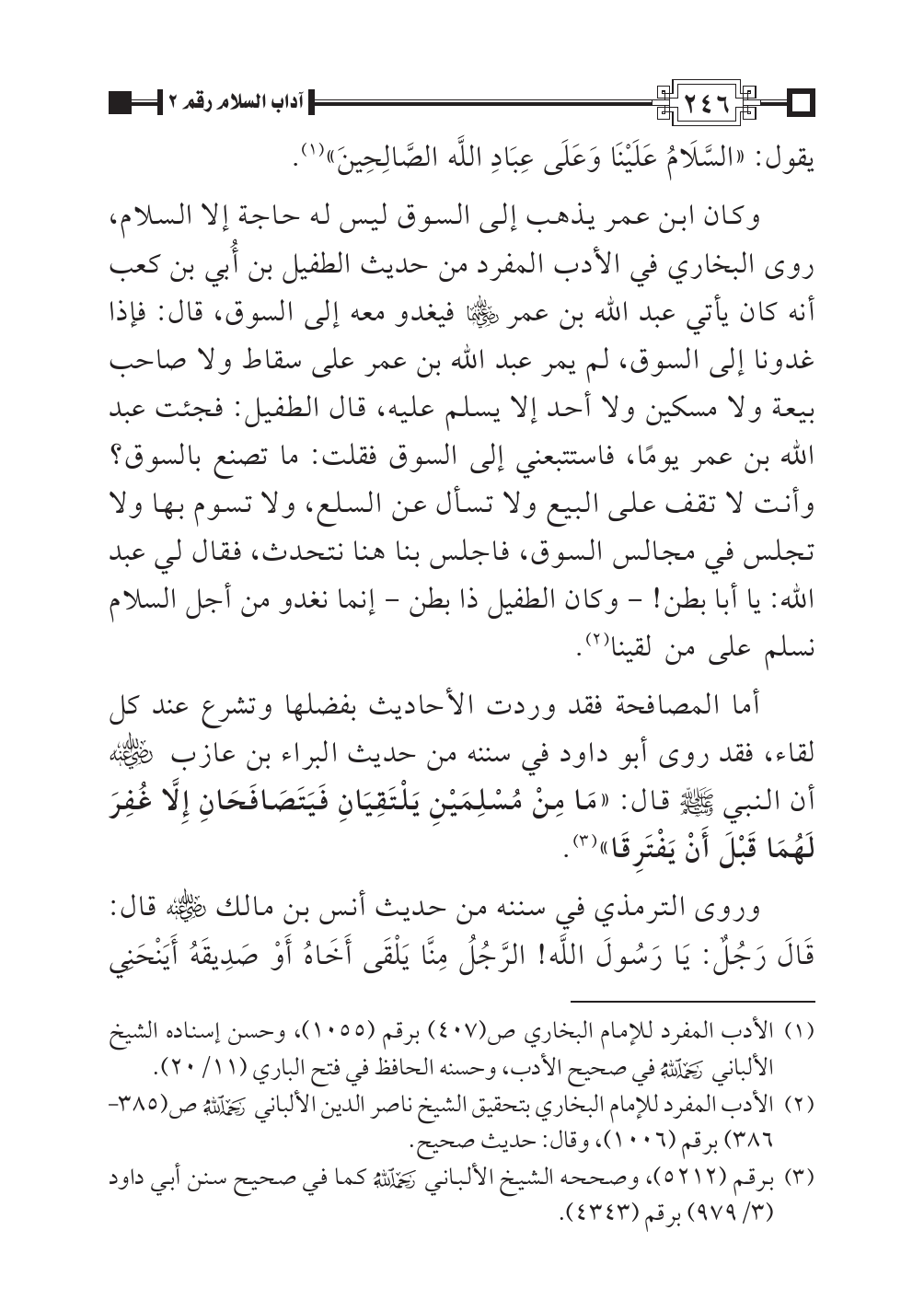 وكان ابن عمر يذهب إلى السوق ليس له حاجة إلا السلام، روى البخاري في الأدب المفرد من حديث الطفيل بن أُبي بن كعب أنه كان يأتي عبد الله بن عمر -رضي الله عنهما- فيغدو معه إلى السوق، قال: فإذا غدونا إلى السوق، لم يمر عبد الله بن عمر على سقاط ولا صاحب بيعة ولا مسكين ولا أحد إلا يسلم عليه، قال الطفيل: فجئت عبد الله بن عمر يومًا، فاستتبعني إلى السوق فقلت: ما تصنع بالسوق؟ وأنت لا تقف على البيع ولا تسأل عن السلع، ولا تسوم بها ولا تجلس في مجالس السوق، فاجلس بنا هنا نتحدث، فقال لي عبد الله: يا أبا بطن! - وكان الطفيل ذا بطن - إنما نغدو من أجل السلام نسلم على من لقينا (¬٢).