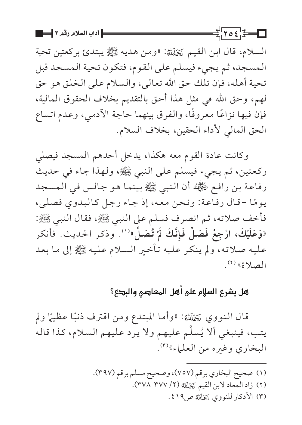 وكانت عادة القوم معه هكذا، يدخل أحدهم المسجد فيصلي ركعتين، ثم يجيء فيسلم على النبي - صلى الله عليه وسلم -، ولهذا جاء في حديث رفاعة بن رافع -رضي الله عنه- أن النبي - صلى الله عليه وسلم - بينما هو جالس في المسجد يومًا -قال رفاعة: ونحن معه، إذ جاء رجل كالبدوي فصلى، فأخف صلاته، ثم انصرف فسلم على النبي - صلى الله عليه وسلم -، فقال النبي - صلى الله عليه وسلم -: «وَعَلَيْكَ، ارْجِعْ فَصَلِّ فَإِنَّكَ لَمْ تُصَلِّ» (¬١). وذكر الحديث. فأنكر عليه صلاته، ولم ينكر عليه تأخير السلام عليه - صلى الله عليه وسلم - إلى ما بعد الصلاة» (¬٢).