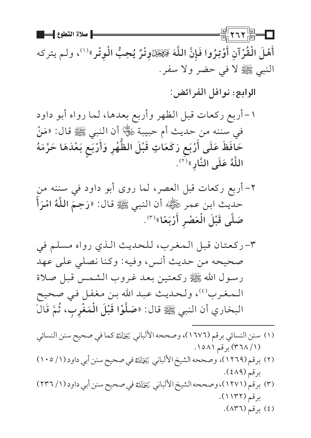 ٢ - أربع ركعات قبل العصر، لما روى أبو داود في سننه من حديث ابن عمر -رضي الله عنه- أن النبي - صلى الله عليه وسلم - قال: «رَحِمَ اللَّهُ امْرَأً صَلَّى قَبْلَ الْعَصْرِ أَرْبَعًا» (¬٣).