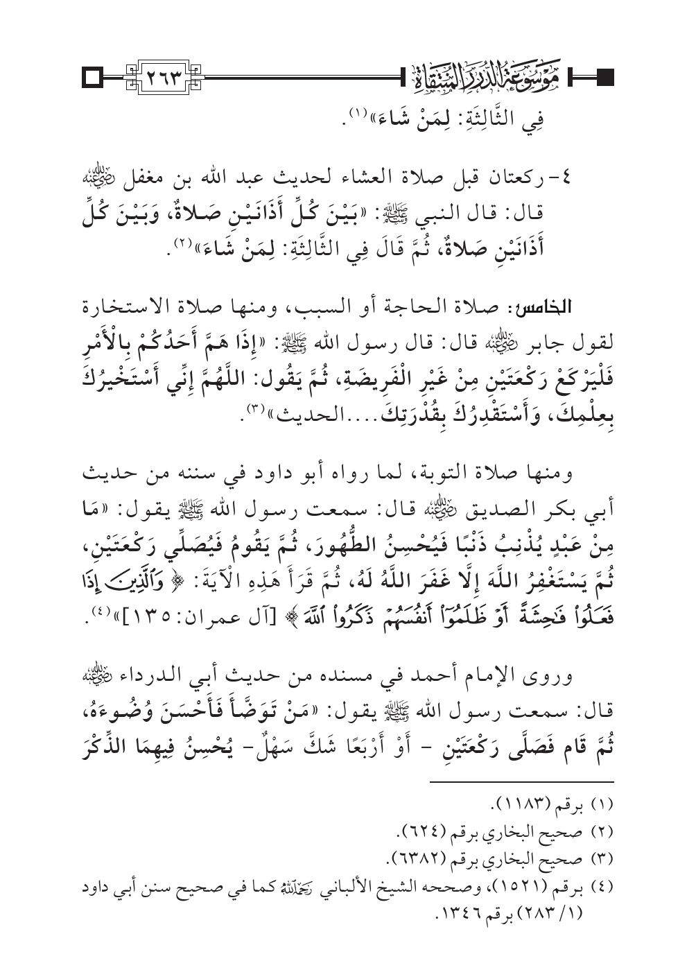 ٤ - ركعتان قبل صلاة العشاء لحديث عبد الله بن مغفل -رضي الله عنه- قال: قال النبي - صلى الله عليه وسلم -: «بَيْنَ كُلِّ أَذَانَيْنِ صَلاةٌ، وَبَيْنَ كُلِّ أَذَانَيْنِ صَلاةٌ، ثُمَّ قَالَ فِي الثَّالِثَةِ: لِمَنْ شَاءَ» (¬٢).
