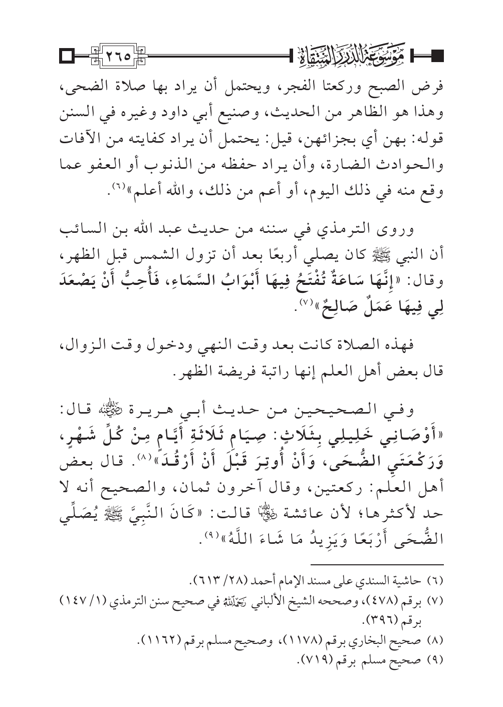 وفي الصحيحين من حديث أبي هريرة -رضي الله عنه- قال: «أَوْصَانِي خَلِيلِي بِثَلَاثٍ: صِيَامِ ثَلَاثَةِ أَيَّامٍ مِنْ كُلِّ شَهْرٍ، وَرَكْعَتَيِ الضُّحَى، وَأَنْ أُوتِرَ قَبْلَ أَنْ أَرْقُدَ» (¬٣). قال بعض أهل العلم: ركعتين، وقال آخرون ثمان، والصحيح أنه لا حد لأكثرها؛ لأن عائشة -رضي الله عنها- قالت: «كَانَ النَّبِيَّ - صلى الله عليه وسلم - يُصَلِّي الضُّحَى أَرْبَعًا وَيَزِيدُ مَا شَاءَ اللَّهُ» (¬٤).