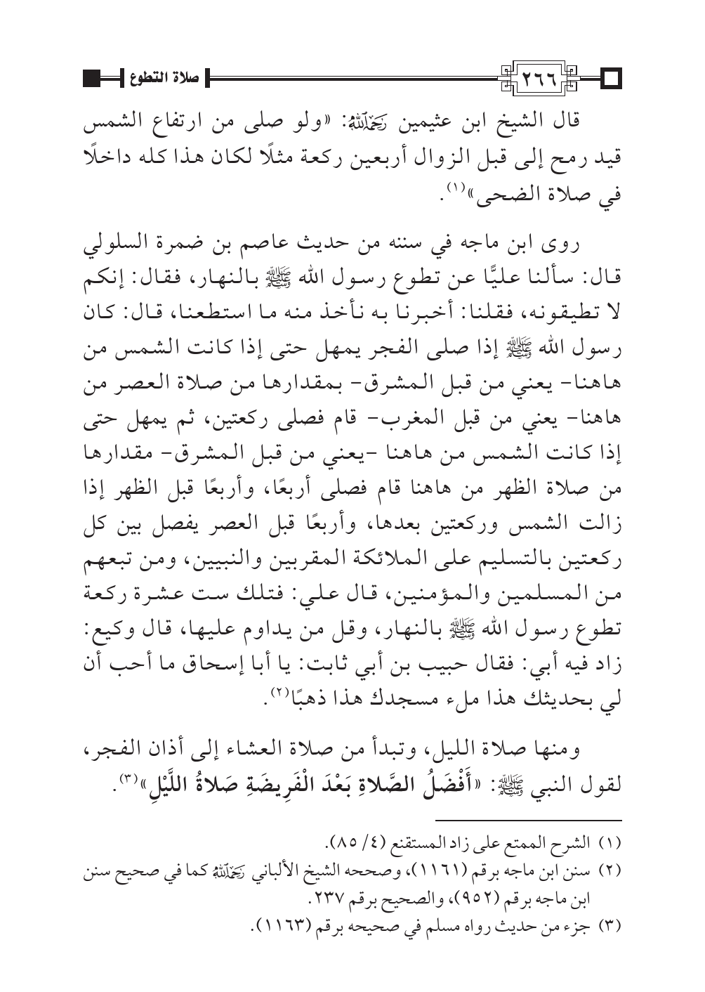روى ابن ماجه في سننه من حديث عاصم بن ضمرة السلولي قال: سألنا عليًّا عن تطوع رسول الله - صلى الله عليه وسلم - بالنهار، فقال: إنكم لا تطيقونه، فقلنا: أخبرنا به نأخذ منه ما استطعنا، قال: كان رسول الله - صلى الله عليه وسلم - إذا صلى الفجر يمهل حتى إذا كانت الشمس من هاهنا- يعني من قبل المشرق- بمقدارها من صلاة العصر من هاهنا- يعني من قبل المغرب- قام فصلى ركعتين، ثم يمهل حتى إذا كانت الشمس من هاهنا -يعني من قبل المشرق- مقدارها من صلاة الظهر من هاهنا قام فصلى أربعًا، وأربعًا قبل الظهر إذا زالت الشمس وركعتين بعدها، وأربعًا قبل العصر يفصل بين كل ركعتين بالتسليم على الملائكة المقربين والنبيين، ومن تبعهم من المسلمين والمؤمنين، قال علي: فتلك ست عشرة ركعة تطوع رسول الله - صلى الله عليه وسلم - بالنهار، وقل من يداوم عليها، قال وكيع: زاد فيه أبي: فقال حبيب بن أبي ثابت: يا أبا إسحاق ما أحب أن لي بحديثك هذا ملء مسجدك هذا ذهبًا (¬٢).