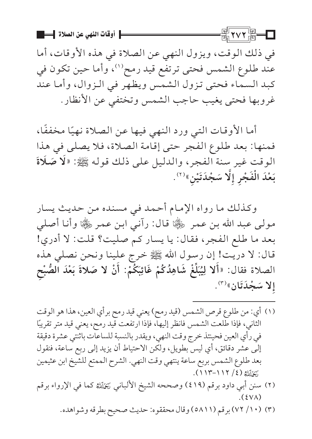 وكذلك ما رواه الإمام أحمد في مسنده من حديث يسار مولى عبد الله بن عمر -رضي الله عنهما- قال: رآني ابن عمر -رضي الله عنهما- وأنا أصلي بعد ما طلع الفجر، فقال: يا يسار كم صليت؟ قلت: لا أدري! قال: لا دريت! إن رسول الله - صلى الله عليه وسلم - خرج علينا ونحن نصلي هذه الصلاة فقال: «أَلا لِيُبَلِّغْ شَاهِدُكُمْ غَائِبَكُمْ: أَنْ لا صَلاةَ بَعْدَ الصُّبْحِ إِلا سَجْدَتَان» (¬٣).