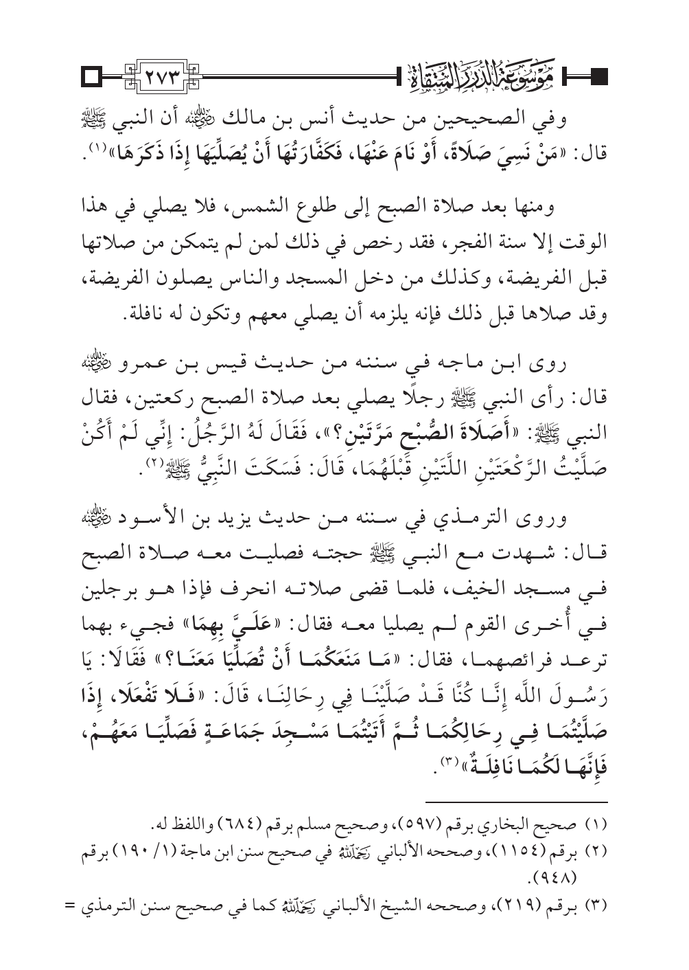 روى ابن ماجه في سننه من حديث قيس بن عمرو -رضي الله عنه- قال: رأى النبي - صلى الله عليه وسلم - رجلًا يصلي بعد صلاة الصبح ركعتين، فقال النبي - صلى الله عليه وسلم -: «أَصَلَاةَ الصُّبْحِ مَرَّتَيْنِ؟ »، فَقَالَ لَهُ الرَّجُلُ: إِنِّي لَمْ أَكُنْ صَلَّيْتُ الرَّكْعَتَيْنِ اللَّتَيْنِ قَبْلَهُمَا، قَالَ: فَسَكَتَ النَّبِيُّ - صلى الله عليه وسلم - (¬٢).