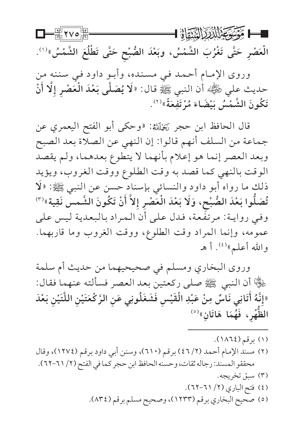 وروى الإمام أحمد في مسنده، وأبو داود في سننه من حديث علي -رضي الله عنه- أن النبي - صلى الله عليه وسلم - قال: «لَا يُصَلَّى بَعْدَ الْعَصْرِ إِلَّا أَنْ تَكُونَ الشَّمْسُ بَيْضَاءَ مُرْتَفِعَةً» (¬٢).