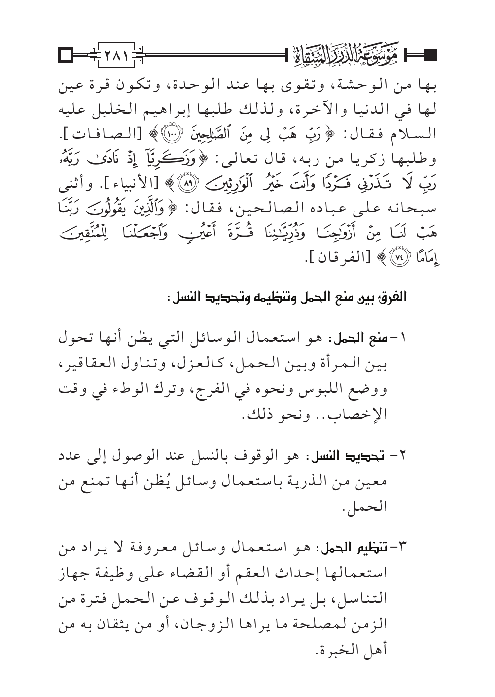 ٣ - تنظيم الحمل: هو استعمال وسائل معروفة لا يراد من استعمالها إحداث العقم أو القضاء على وظيفة جهاز التناسل، بل يراد بذلك الوقوف عن الحمل فترة من الزمن لمصلحة ما يراها الزوجان، أو من يثقان به من أهل الخبرة