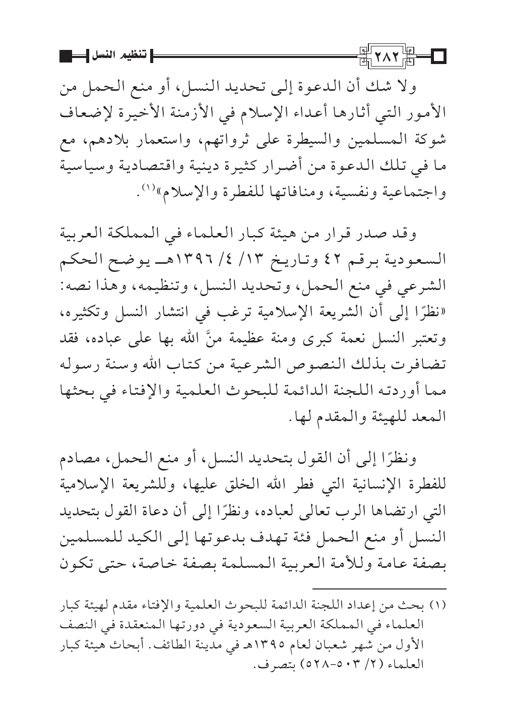 وقد صدر قرار من هيئة كبار العلماء في المملكة العربية السعودية برقم ٤٢ وتاريخ ١٣/ ٤/١٣٩٦ هـ يوضح الحكم الشرعي في منع الحمل، وتحديد النسل، وتنظيمه، وهذا نصه: «نظرًا إلى أن الشريعة الإسلامية ترغب في انتشار النسل وتكثيره، وتعتبر النسل نعمة كبرى ومنة عظيمة منَّ الله بها على عباده، فقد تضافرت بذلك النصوص الشرعية من كتاب الله وسنة رسوله مما أوردته اللجنة الدائمة للبحوث العلمية والإفتاء في بحثها المعد للهيئة والمقدم لها.