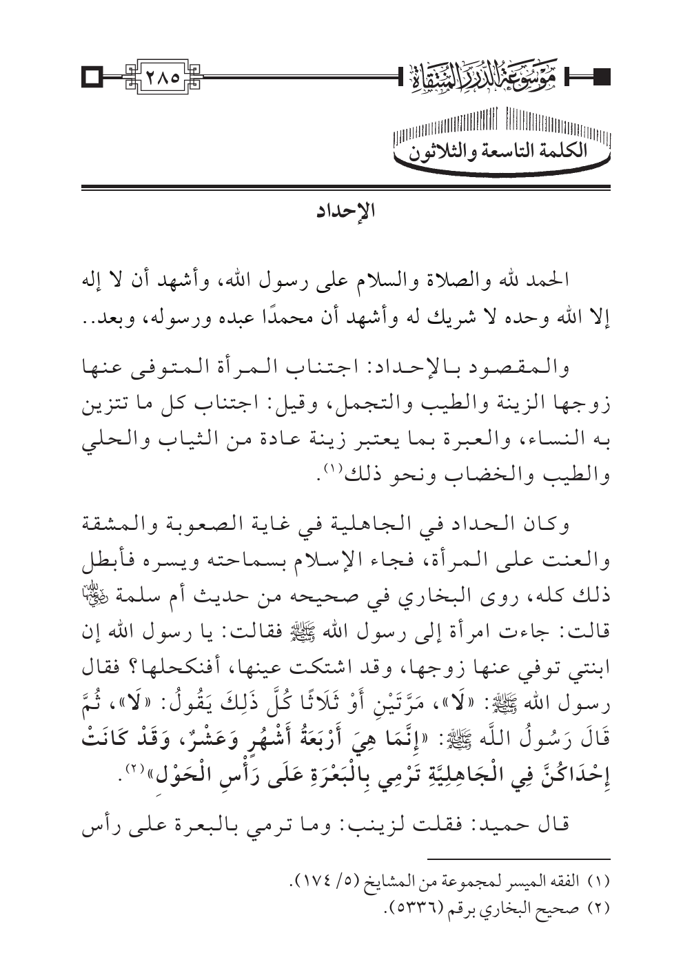 وكان الحداد في الجاهلية في غاية الصعوبة والمشقة والعنت على المرأة، فجاء الإسلام بسماحته ويسره فأبطل ذلك كله، روى البخاري في صحيحه من حديث أم سلمة -رضي الله عنها- قالت: جاءت امرأة إلى رسول الله - صلى الله عليه وسلم - فقالت: يا رسول الله إن ابنتي توفي عنها زوجها، وقد اشتكت عينها، أفنكحلها؟ فقال رسول الله - صلى الله عليه وسلم -: «لَا»، مَرَّتَيْنِ أَوْ ثَلَاثًا كُلَّ ذَلِكَ يَقُولُ: «لَا»، ثُمَّ قَالَ رَسُولُ اللَّه - صلى الله عليه وسلم -: «إِنَّمَا هِيَ أَرْبَعَةُ أَشْهُرٍ وَعَشْرٌ، وَقَدْ كَانَتْ إِحْدَاكُنَّ فِي الْجَاهِلِيَّةِ تَرْمِي بِالْبَعْرَةِ عَلَى رَأْسِ الْحَوْلِ» (¬٢).
