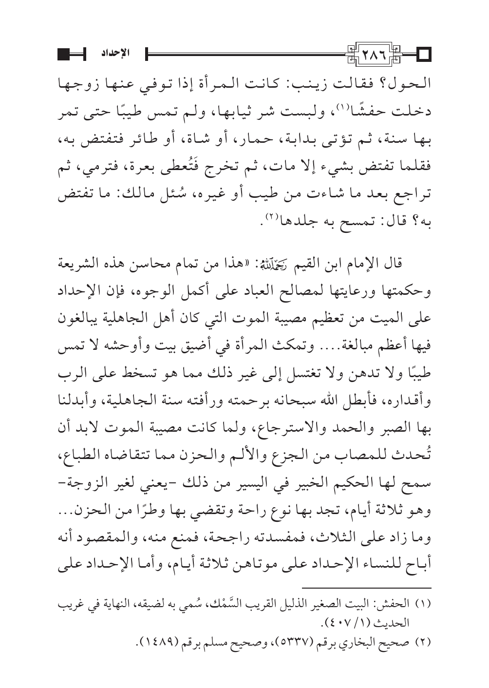 الحول؟ فقالت زينب: كانت المرأة إذا توفي عنها زوجها دخلت حفشًا (¬١)، ولبست شر ثيابها، ولم تمس طيبًا حتى تمر بها سنة، ثم تؤتى بدابة، حمار، أو شاة، أو طائر فتفتض به، فقلما تفتض بشيء إلا مات، ثم تخرج فَتُعطى بعرة، فترمي، ثم تراجع بعد ما شاءت من طيب أو غيره، سُئل مالك: ما تفتض به؟ قال: تمسح به جلدها (¬٢).