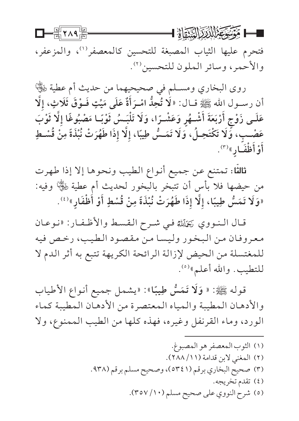 روى البخاري ومسلم في صحيحيهما من حديث أم عطية -رضي الله عنها- أن رسول الله - صلى الله عليه وسلم - قال: «لَا تُحِدُّ امْرَأَةٌ عَلَى مَيِّتٍ فَوْقَ ثَلَاثٍ، إِلَّا عَلَى زَوْجٍ أَرْبَعَةَ أَشْهُرٍ وَعَشْرًا، وَلَا تَلْبَسُ ثَوْبًا مَصْبُوغًا إِلَّا ثَوْبَ عَصْبٍ، وَلَا تَكْتَحِلُ، وَلَا تَمَسُّ طِيبًا، إِلَّا إِذَا طَهُرَتْ نُبْذَةً مِنْ قُسْطٍ أَوْ أَظْفَارٍ» (¬٣).