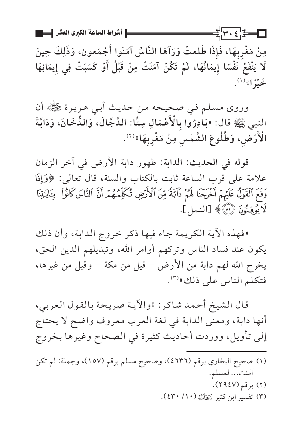 وروى مسلم في صحيحه من حديث أبي هريرة -رضي الله عنه- أن النبي - صلى الله عليه وسلم - قال: «بَادِرُوا بِالْأَعْمَالِ سِتًّا: الدَّجَّالَ، وَالدُّخَانَ، وَدَابَّةَ الْأَرْضِ، وَطُلُوعَ الشَّمْسِ مِنْ مَغْرِبِهَا» (¬٢).