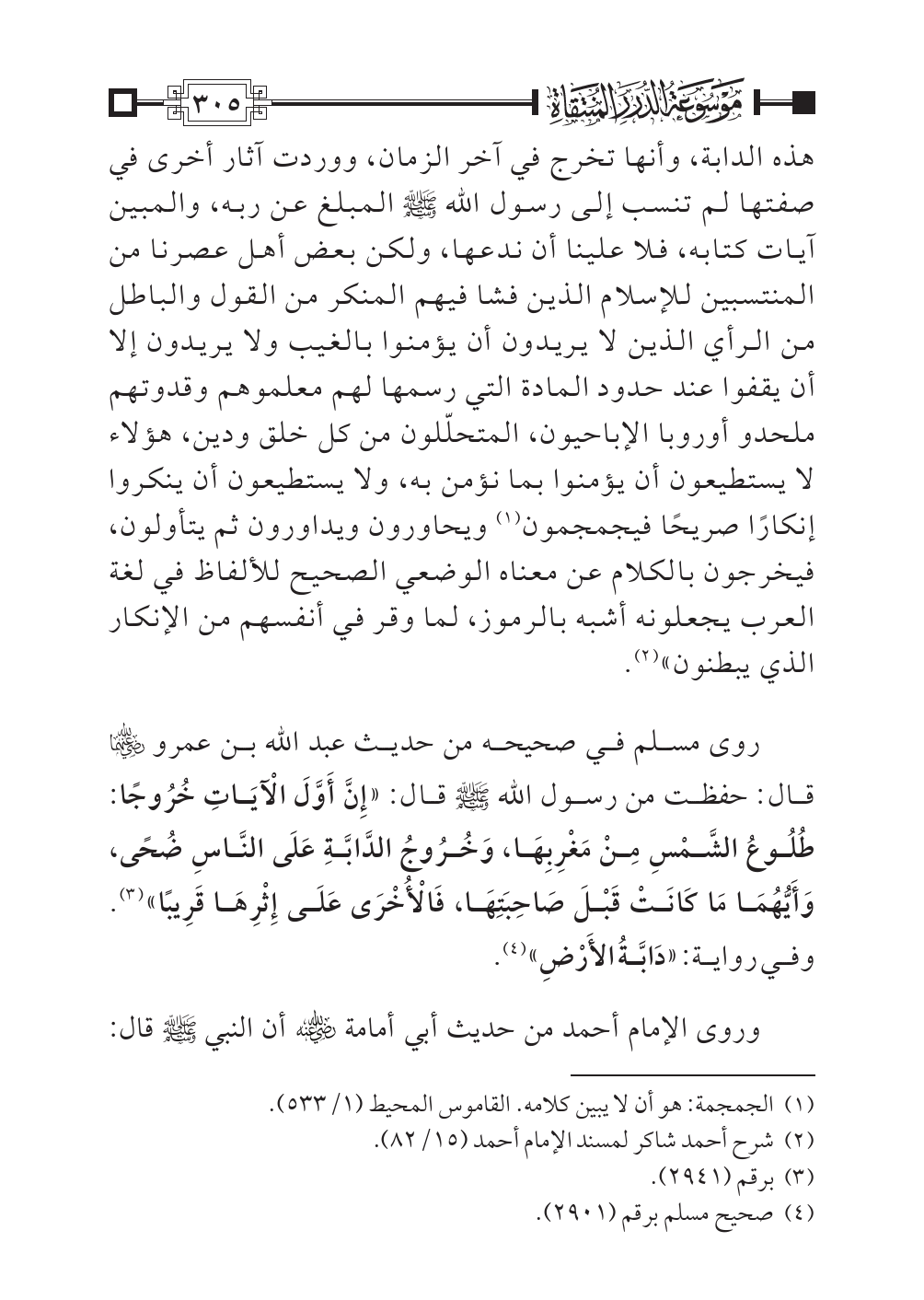 هذه الدابة، وأنها تخرج في آخر الزمان، ووردت آثار أخرى في صفتها لم تنسب إلى رسول الله - صلى الله عليه وسلم - المبلغ عن ربه، والمبين آيات كتابه، فلا علينا أن ندعها، ولكن بعض أهل عصرنا من المنتسبين للإسلام الذين فشا فيهم المنكر من القول والباطل من الرأي الذين لا يريدون أن يؤمنوا بالغيب ولا يريدون إلا أن يقفوا عند حدود المادة التي رسمها لهم معلموهم وقدوتهم ملحدو أوروبا الإباحيون، المتحلّلون من كل خلق ودين، هؤلاء لا يستطيعون أن يؤمنوا بما نؤمن به، ولا يستطيعون أن ينكروا إنكارًا صريحًا فيجمجمون (¬١) ويحاورون ويداورون ثم يتأولون، فيخرجون بالكلام عن معناه الوضعي الصحيح للألفاظ في لغة العرب يجعلونه أشبه بالرموز، لما وقر في أنفسهم من الإنكار الذي يبطنون» (¬٢).