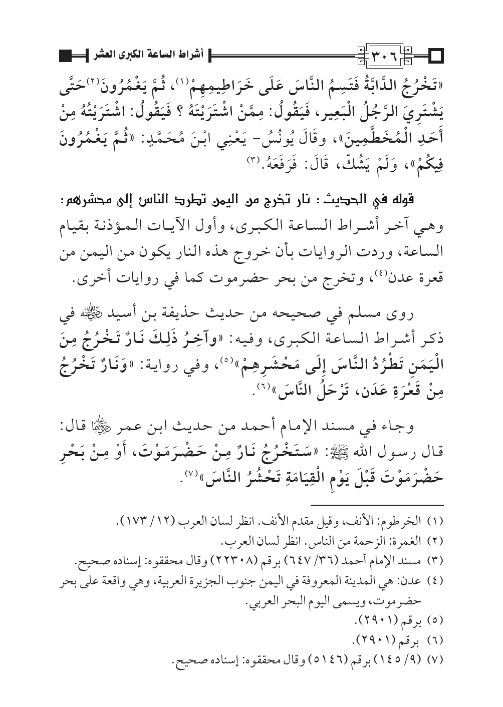 وجاء في مسند الإمام أحمد من حديث ابن عمر -رضي الله عنهما- قال: قال رسول الله - صلى الله عليه وسلم -: «سَتَخْرُجُ نَارٌ مِنْ حَضْرَمَوْتَ، أَوْ مِنْ بَحْرِ حَضْرَمَوْتَ قَبْلَ يَوْمِ الْقِيَامَةِ تَحْشُرُ النَّاسَ» (¬٧).