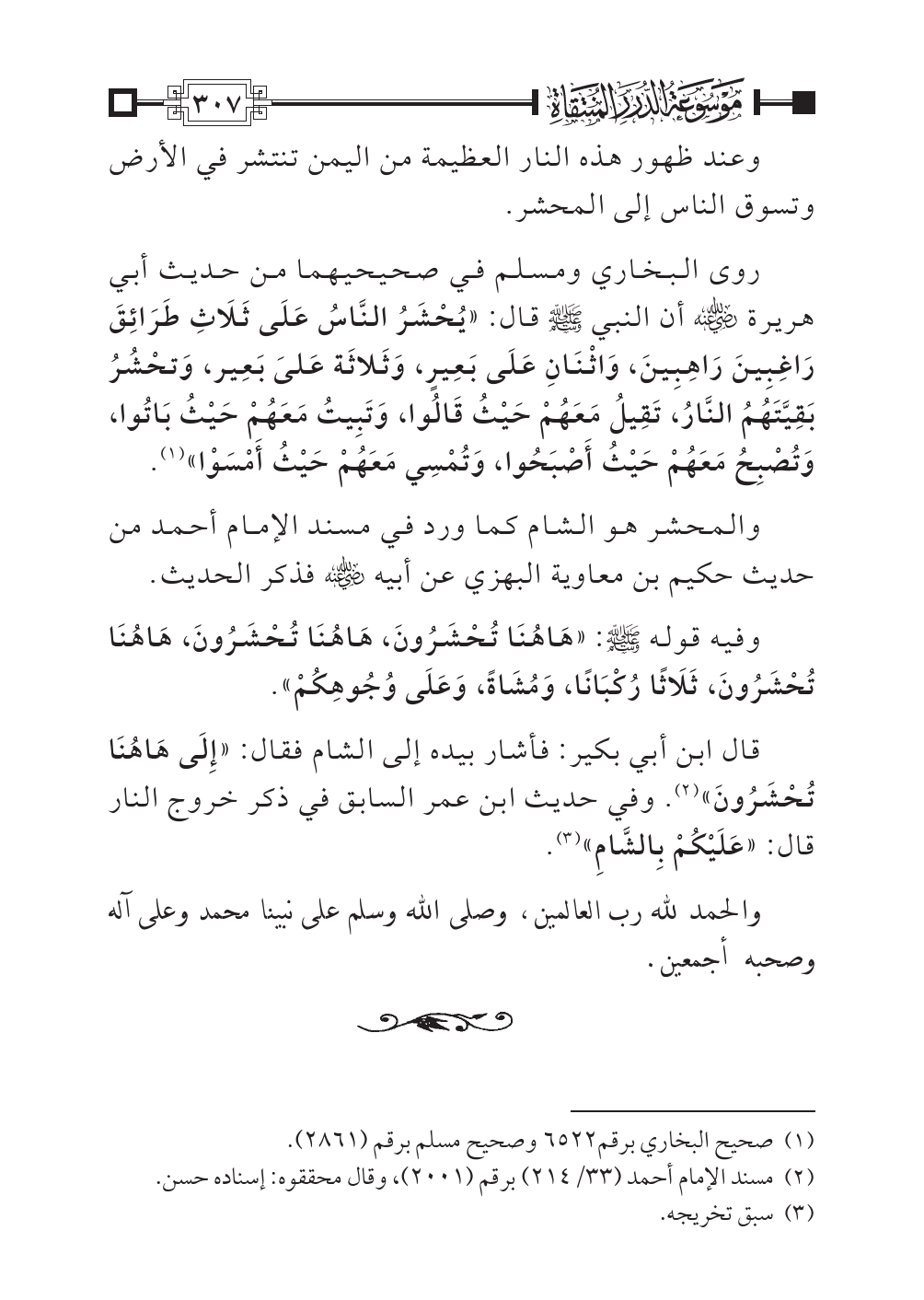 قال ابن أبي بكير: فأشار بيده إلى الشام فقال: «إِلَى هَاهُنَا تُحْشَرُونَ» (¬٢). وفي حديث ابن عمر السابق في ذكر خروج النار قال: «عَلَيْكُمْ بِالشَّامِ» (¬٣).