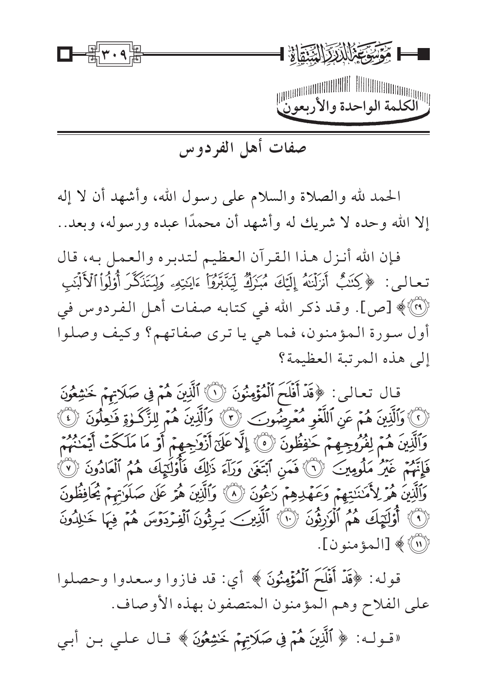 فإن الله أنزل هذا القرآن العظيم لتدبره والعمل به، قال تعالى: {كِتَابٌ أَنْزَلْنَاهُ إِلَيْكَ مُبَارَكٌ لِيَدَّبَّرُوا آيَاتِهِ وَلِيَتَذَكَّرَ أُولُو الْأَلْبَابِ (٢٩)} [ص]. وقد ذكر الله في كتابه صفات أهل الفردوس في أول سورة المؤمنون، فما هي يا ترى صفاتهم؟ وكيف وصلوا إلى هذه المرتبة العظيمة؟