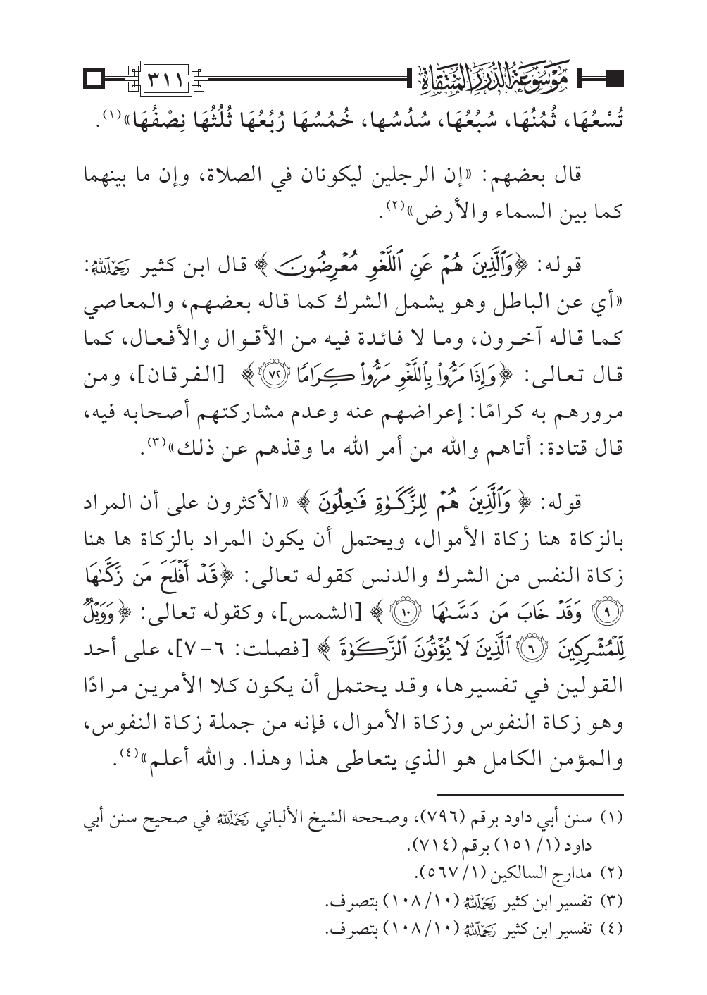 قوله: {وَالَّذِينَ هُمْ لِلزَّكَاةِ فَاعِلُونَ} «الأكثرون على أن المراد بالزكاة هنا زكاة الأموال، ويحتمل أن يكون المراد بالزكاة ها هنا زكاة النفس من الشرك والدنس كقوله تعالى: {قَدْ أَفْلَحَ مَنْ زَكَّاهَا (٩) وَقَدْ خَابَ مَنْ دَسَّاهَا (١٠)} [الشمس]، وكقوله تعالى: {وَوَيْلٌ لِلْمُشْرِكِينَ (٦) الَّذِينَ لَا يُؤْتُونَ الزَّكَاةَ} [فصلت: ٦ - ٧]، على أحد القولين في تفسيرها، وقد يحتمل أن يكون كلا الأمرين مرادًا وهو زكاة النفوس وزكاة الأموال، فإنه من جملة زكاة النفوس، والمؤمن الكامل هو الذي يتعاطى هذا وهذا. والله أعلم» (¬٤).