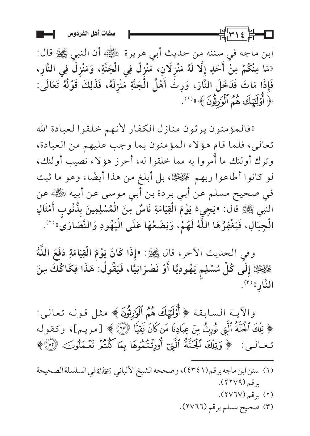 ابن ماجه في سننه من حديث أبي هريرة -رضي الله عنه- أن النبي - صلى الله عليه وسلم - قال: «مَا مِنْكُمْ مِنْ أَحَدٍ إِلَّا لَهُ مَنْزِلَانِ، مَنْزِلٌ فِي الْجَنَّةِ، وَمَنْزِلٌ فِي النَّارِ، فَإِذَا مَاتَ فَدَخَلَ النَّارَ، وَرِثَ أَهْلُ الْجَنَّةِ مَنْزِلَهُ، فَذَلِكَ قَوْلُهُ تَعَالَى: {أُولَئِكَ هُمُ الْوَارِثُونَ}» (¬١).