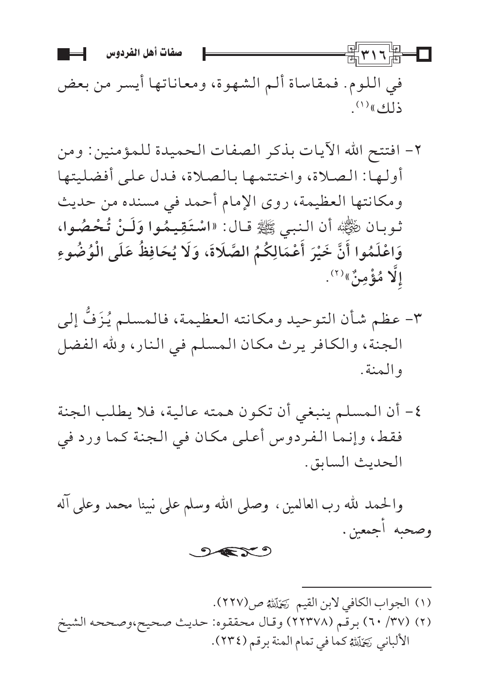 ٢ - افتتح الله الآيات بذكر الصفات الحميدة للمؤمنين: ومن أولها: الصلاة، واختتمها بالصلاة، فدل على أفضليتها ومكانتها العظيمة، روى الإمام أحمد في مسنده من حديث ثوبان -رضي الله عنه- أن النبي - صلى الله عليه وسلم - قال: «اسْتَقِيمُوا وَلَنْ تُحْصُوا، وَاعْلَمُوا أَنَّ خَيْرَ أَعْمَالِكُمُ الصَّلَاةَ، وَلَا يُحَافِظُ عَلَى الْوُضُوءِ إِلَّا مُؤْمِنٌ» (¬٢).
