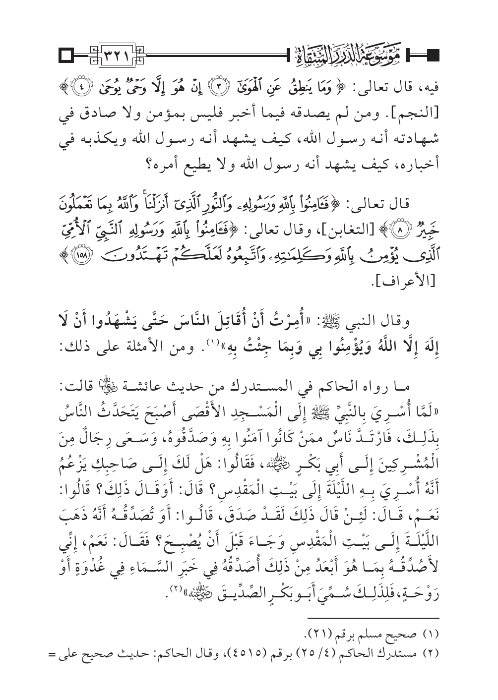 ما رواه الحاكم في المستدرك من حديث عائشة -رضي الله عنها- قالت: «لَمَّا أُسْرِيَ بِالنَّبِيِّ - صلى الله عليه وسلم - إِلَى الْمَسْجِدِ الأَقْصَى أَصْبَحَ يَتَحَدَّثُ النَّاسُ بِذَلِكَ، فَارْتَدَّ نَاسٌ ممَنْ كَانُوا آمَنُوا بِهِ وَصَدَّقُوهُ، وَسَعَى رِجَالٌ مِنَ الْمُشْرِكِينَ إِلَى أَبِي بَكْرٍ -رضي الله عنه-، فَقَالُوا: هَلْ لَكَ إِلَى صَاحِبِكِ يَزْعُمُ أَنَّهُ أُسْرِيَ بِهِ اللَّيْلَةَ إِلَى بَيْتِ الْمَقْدِسِ؟ قَالَ: أَوَقَالَ ذَلِكَ؟ قَالُوا: نَعَمْ، قَالَ: لَئِنْ قَالَ ذَلِكَ لَقَدْ صَدَقَ، قَالُوا: أَوَ تُصَدِّقُهُ أَنَّهُ ذَهَبَ اللَّيْلَةَ إِلَى بَيْتِ الْمَقْدِسِ وَجَاءَ قَبْلَ أَنْ يُصْبِحَ؟ فَقَالَ: نَعَمْ، إِنِّي لأَصُدِّقُهُ بِمَا هُوَ أَبْعَدُ مِنْ ذَلِكَ أُصَدِّقُهُ فِي خَبَرِ السَّمَاءِ فِي غُدْوَةٍ أَوْ رَوْحَةٍ، فَلِذَلِكَ سُمِّيَ أَبَو بَكْرٍ الصِّدِّيقَ -رضي الله عنه-» (¬٢).