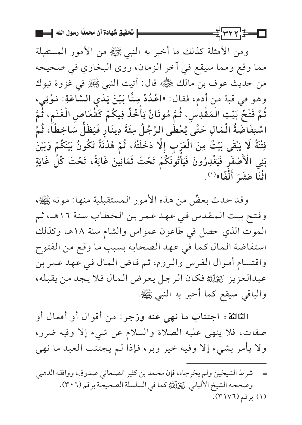 ومن الأمثلة كذلك ما أخبر به النبي - صلى الله عليه وسلم - من الأمور المستقبلة مما وقع ومما سيقع في آخر الزمان، روى البخاري في صحيحه من حديث عوف بن مالك -رضي الله عنه- قال: أتيت النبي - صلى الله عليه وسلم - في غزوة تبوك وهو في قبة من أدم، فقال: «اعْدُدْ سِتًّا بَيْنَ يَدَيِ السَّاعَةِ: مَوْتِي، ثُمَّ فَتْحُ بَيْتِ الْمَقْدِسِ، ثُمَّ مُوتَانٌ يَأْخُذُ فِيكُمْ كَقُعَاصِ الْغَنَمِ، ثُمَّ اسْتِفَاضَةُ الْمَالِ حَتَّى يُعْطَى الرَّجُلُ مِئَةَ دِينَارٍ فَيَظَلُّ سَاخِطًا، ثُمَّ فِتْنَةٌ لَا يَبْقَى بَيْتٌ مِنَ الْعَرَبِ إِلَّا دَخَلَتْهُ، ثُمَّ هُدْنَةٌ تَكُونُ بَيْنَكُمْ وَبَيْنَ بَنِي الْأَصْفَرِ فَيَغْدِرُونَ فَيَأْتُونَكُمْ تَحْتَ ثَمَانِينَ غَايَةً، تَحْتَ كُلِّ غَايَةٍ اثْنَا عَشَرَ أَلْفًا» (¬١).