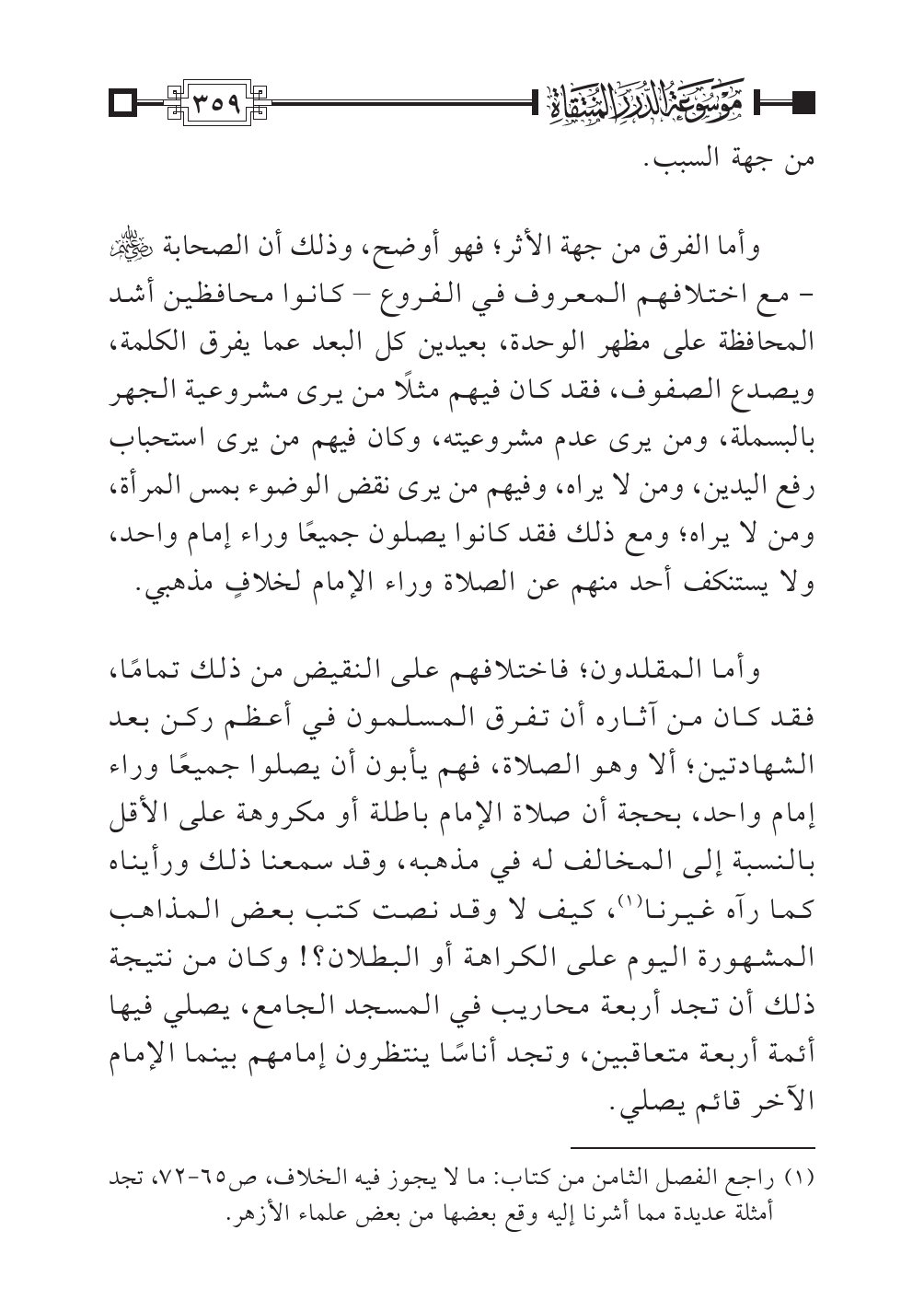 وأما الفرق من جهة الأثر؛ فهو أوضح، وذلك أن الصحابة -رضي الله عنهم- - مع اختلافهم المعروف في الفروع - كانوا محافظين أشد المحافظة على مظهر الوحدة، بعيدين كل البعد عما يفرق الكلمة، ويصدع الصفوف، فقد كان فيهم مثلًا من يرى مشروعية الجهر بالبسملة، ومن يرى عدم مشروعيته، وكان فيهم من يرى استحباب رفع اليدين، ومن لا يراه، وفيهم من يرى نقض الوضوء بمس المرأة، ومن لا يراه؛ ومع ذلك فقد كانوا يصلون جميعًا وراء إمام واحد، ولا يستنكف أحد منهم عن الصلاة وراء الإمام لخلافٍ مذهبي.