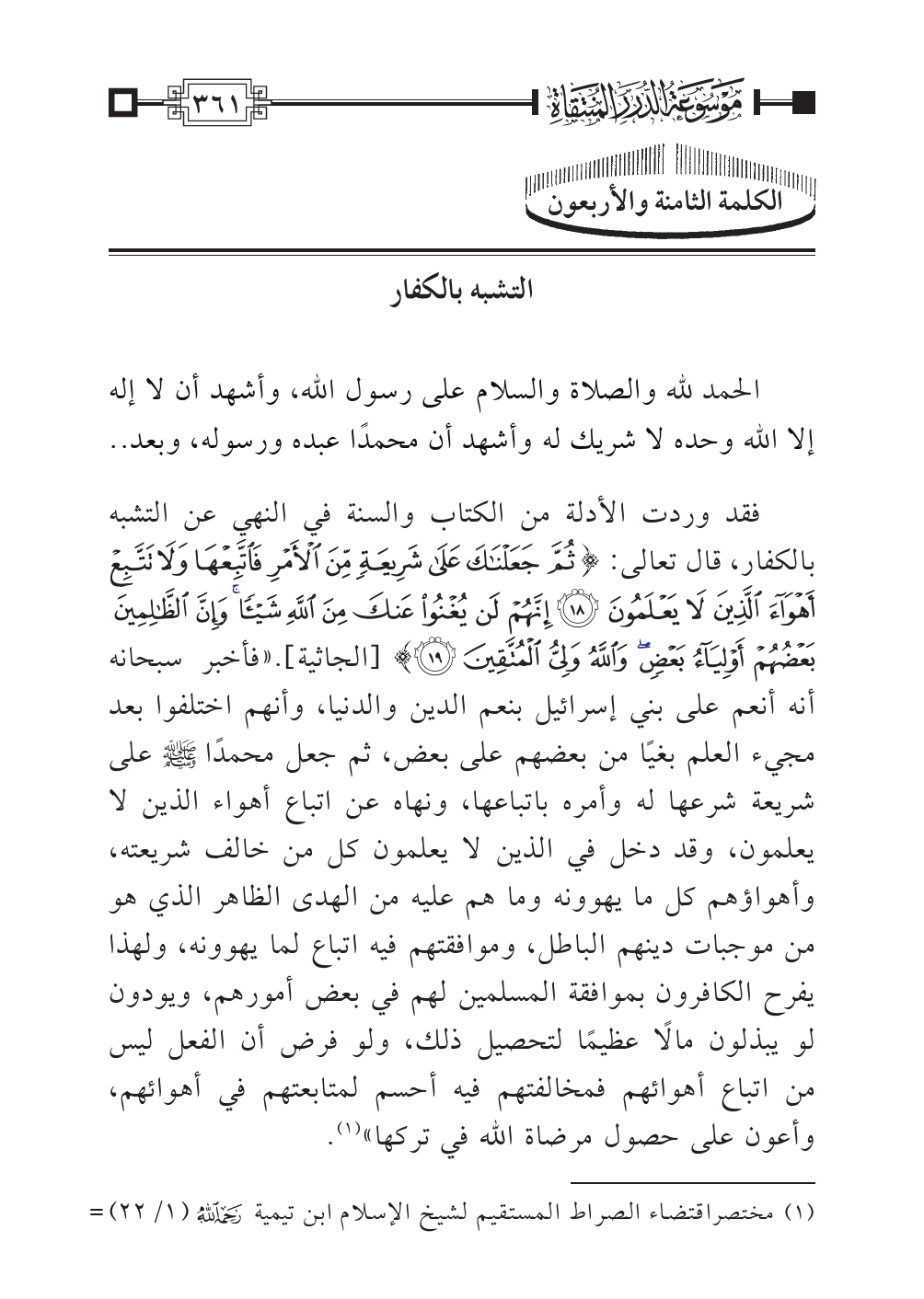 (¬١). مختصراقتضاء الصراط المستقيم لشيخ الإسلام ابن تيمية -رحمه الله- (١/ ٢٢) بتحقيق د. ناصر العقل بتصرف.