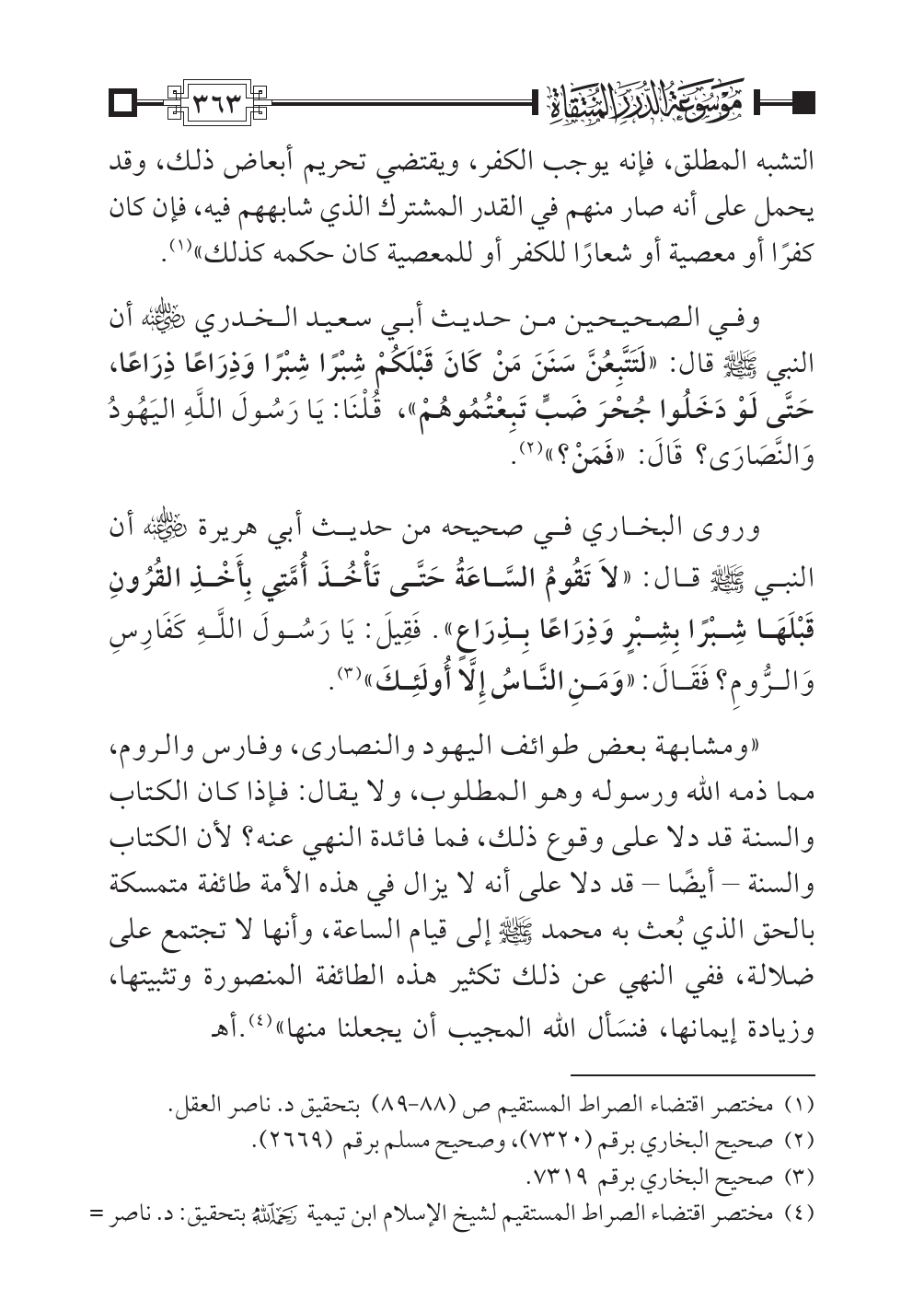 «ومشابهة بعض طوائف اليهود والنصارى، وفارس والروم، مما ذمه الله ورسوله وهو المطلوب، ولا يقال: فإذا كان الكتاب والسنة قد دلا على وقوع ذلك، فما فائدة النهي عنه؟ لأن الكتاب والسنة - أيضًا - قد دلا على أنه لا يزال في هذه الأمة طائفة متمسكة بالحق الذي بُعث به محمد - صلى الله عليه وسلم - إلى قيام الساعة، وأنها لا تجتمع على ضلالة، ففي النهي عن ذلك تكثير هذه الطائفة المنصورة وتثبيتها، وزيادة إيمانها، فنسَأل الله المجيب أن يجعلنا منها» (¬٤).أهـ