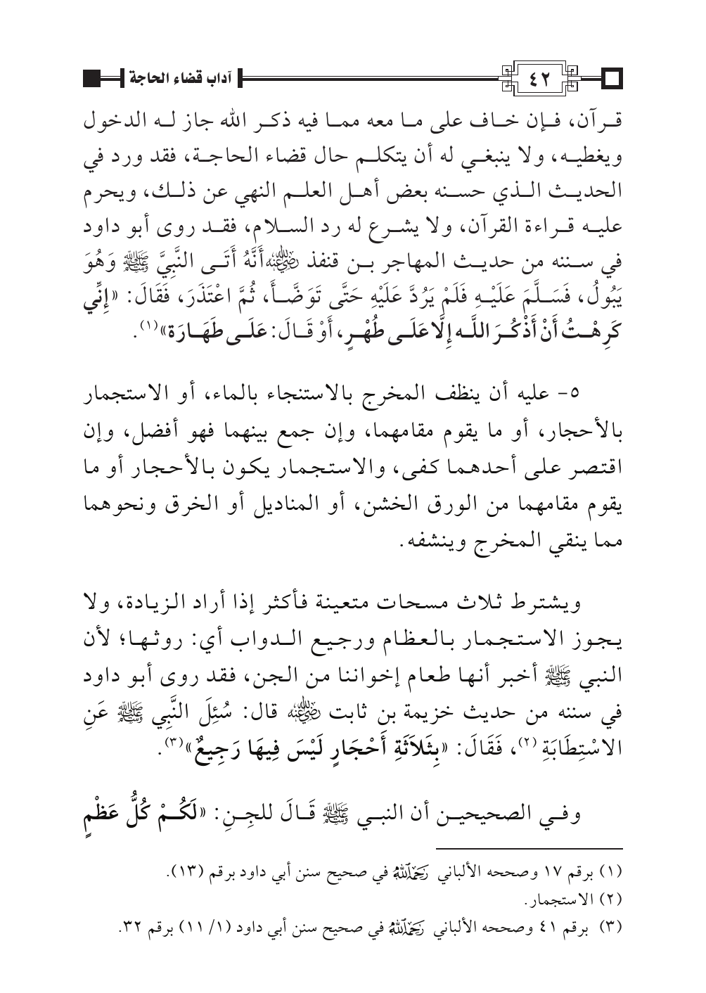 ويشترط ثلاث مسحات متعينة فأكثر إذا أراد الزيادة، ولا يجوز الاستجمار بالعظام ورجيع الدواب أي: روثها؛ لأن النبي -صلى الله عليه وسلم- أخبر أنها طعام إخواننا من الجن، فقد روى أبو داود في سننه من حديث خزيمة بن ثابت -رضي الله عنه- قال: سُئِلَ النَّبِي -صلى الله عليه وسلم- عَنِ الاسْتِطَابَةِ (¬٢)، فَقَالَ: «بِثَلَاثَةِ أَحْجَارٍ لَيْسَ فِيهَا رَجِيعٌ» (¬٣).