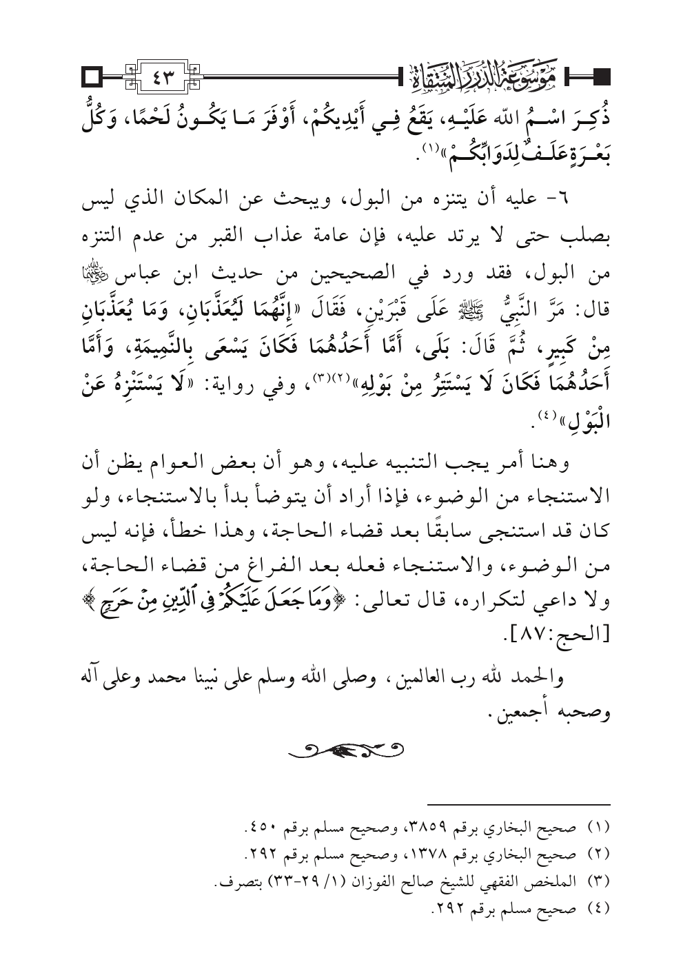 ٦ - عليه أن يتنزه من البول، ويبحث عن المكان الذي ليس بصلب حتى لا يرتد عليه، فإن عامة عذاب القبر من عدم التنزه من البول، فقد ورد في الصحيحين من حديث ابن عباس -رضي الله عنهما- قال: مَرَّ النَّبِيُّ -صلى الله عليه وسلم- عَلَى قَبْرَيْنِ، فَقَالَ «إِنَّهُمَا لَيُعَذَّبَانِ، وَمَا يُعَذَّبَانِ مِنْ كَبِيرٍ، ثُمَّ قَالَ: بَلَى، أَمَّا أَحَدُهُمَا فَكَانَ يَسْعَى بِالنَّمِيمَةِ، وَأَمَّا أَحَدُهُمَا فَكَانَ لَا يَسْتَتِرُ مِنْ بَوْلِهِ» (¬٢) (¬٣)، وفي رواية: «لَا يَسْتَنْزِهُ عَنْ الْبَوْلِ» (¬٤).