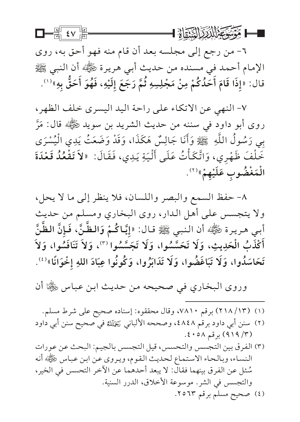 ٦ - من رجع إلى مجلسه بعد أن قام منه فهو أحق به، روى الإمام أحمد في مسنده من حديث أبي هريرة -رضي الله عنه- أن النبي -صلى الله عليه وسلم- قال: «إِذَا قَامَ أَحَدُكُمْ مِنْ مَجْلِسِهِ ثُمَّ رَجَعَ إِلَيْهِ، فَهُوَ أَحَقُّ بِهِ» (¬١).