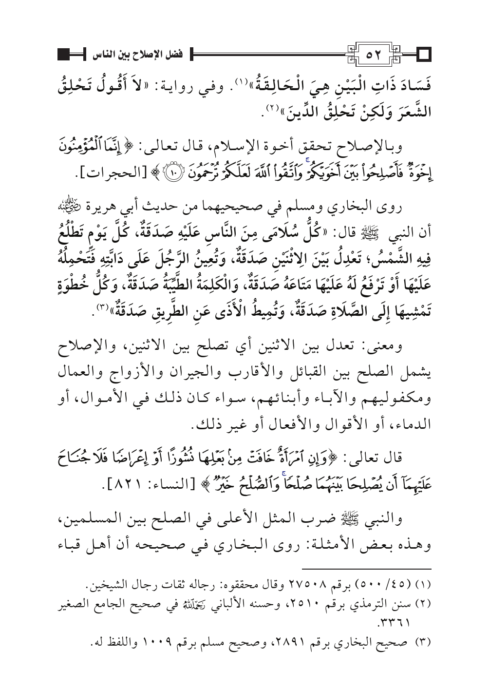 روى البخاري ومسلم في صحيحيهما من حديث أبي هريرة -رضي الله عنه- أن النبي -صلى الله عليه وسلم- قال: «كُلُّ سُلَامَى مِنَ النَّاسِ عَلَيْهِ صَدَقَةٌ، كُلَّ يَوْمٍ تَطْلُعُ فِيهِ الشَّمْسُ؛ تَعْدِلُ بَيْنَ الِاثْنَيْنِ صَدَقَةٌ، وَتُعِينُ الرَّجُلَ عَلَى دَابَّتِهِ فَتَحْمِلُهُ عَلَيْهَا أَوْ تَرْفَعُ لَهُ عَلَيْهَا مَتَاعَهُ صَدَقَةٌ، وَالْكَلِمَةُ الطَّيِّبَةُ صَدَقَةٌ، وَكُلُّ خُطْوَةٍ تَمْشِيهَا إِلَى الصَّلَاةِ صَدَقَةٌ، وَتُمِيطُ الْأَذَى عَنِ الطَّرِيقِ صَدَقَةٌ» (¬٣).