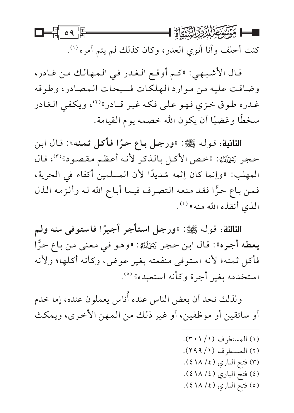 الثانية: قوله -صلى الله عليه وسلم-: «ورجل باع حرًا فأكل ثمنه»: قال ابن حجر -رحمه الله-: «خص الأكل بالذكر لأنه أعظم مقصود» (¬٣)، قال المهلب: «وإنما كان إثمه شديدًا لأن المسلمين أكفاء في الحرية، فمن باع حرًّا فقد منعه التصرف فيما أباح الله له وألزمه الذل الذي أنقذه الله منه» (¬٤).