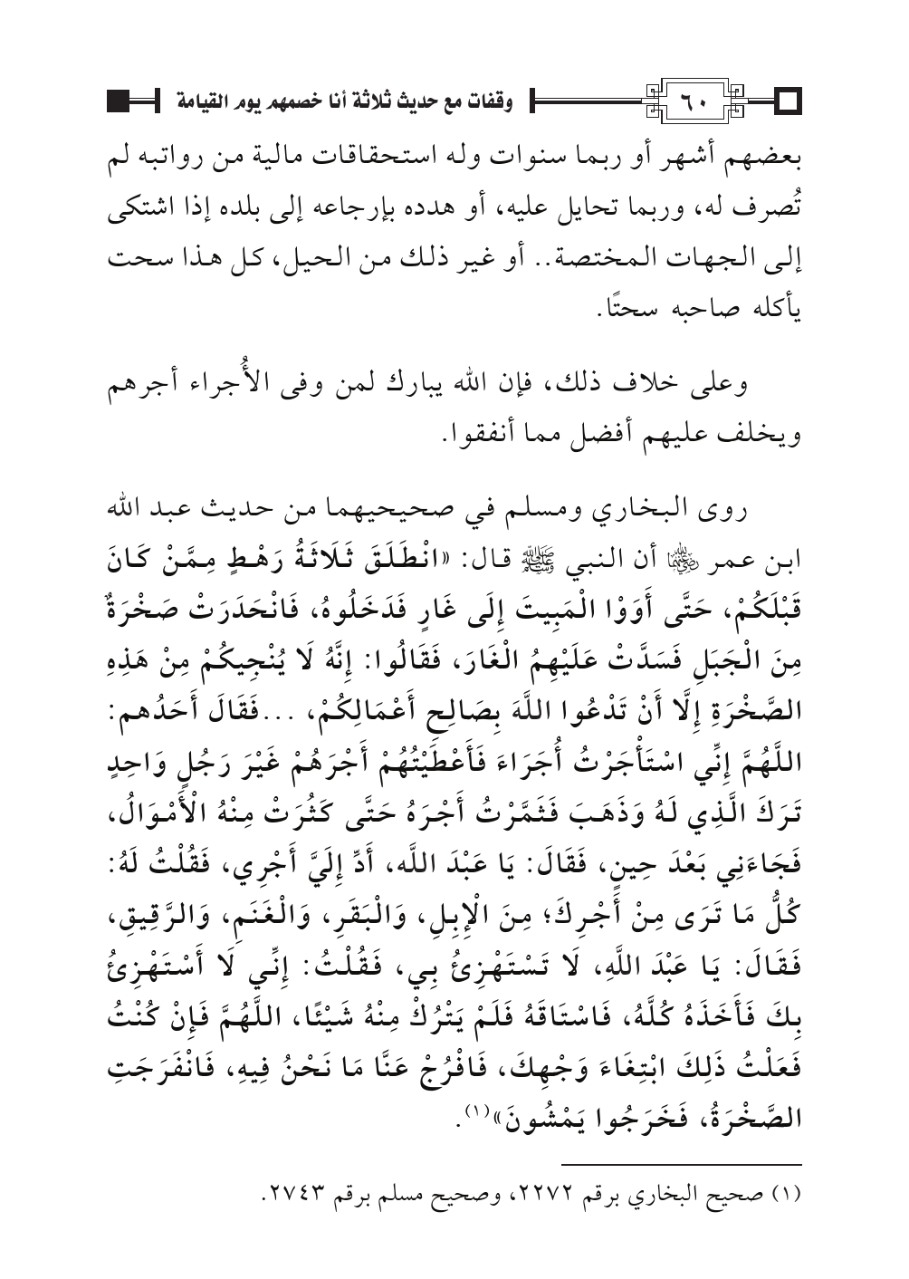 روى البخاري ومسلم في صحيحيهما من حديث عبد الله ابن عمر -رضي الله عنهما- أن النبي -صلى الله عليه وسلم- قال: «انْطَلَقَ ثَلَاثَةُ رَهْطٍ مِمَّنْ كَانَ قَبْلَكُمْ، حَتَّى أَوَوْا الْمَبِيتَ إِلَى غَارٍ فَدَخَلُوهُ، فَانْحَدَرَتْ صَخْرَةٌ مِنَ الْجَبَلِ فَسَدَّتْ عَلَيْهِمُ الْغَارَ، فَقَالُوا: إِنَّهُ لَا يُنْجِيكُمْ مِنْ هَذِهِ الصَّخْرَةِ إِلَّا أَنْ تَدْعُوا اللَّهَ بِصَالِحِ أَعْمَالِكُمْ، ... فَقَالَ أَحَدُهم: اللَّهُمَّ إِنِّي اسْتَأْجَرْتُ أُجَرَاءَ فَأَعْطَيْتُهُمْ أَجْرَهُمْ غَيْرَ رَجُلٍ وَاحِدٍ تَرَكَ الَّذِي لَهُ وَذَهَبَ فَثَمَّرْتُ أَجْرَهُ حَتَّى كَثُرَتْ مِنْهُ الْأَمْوَالُ، فَجَاءَنِي بَعْدَ حِينٍ، فَقَالَ: يَا عَبْدَ اللَّه، أَدِّ إِلَيَّ أَجْرِي، فَقُلْتُ لَهُ: كُلُّ مَا تَرَى مِنْ أَجْرِكَ؛ مِنَ الْإِبِلِ، وَالْبَقَرِ، وَالْغَنَمِ، وَالرَّقِيقِ، فَقَالَ: يَا عَبْدَ اللَّهِ، لَا تَسْتَهْزِئُ بِي، فَقُلْتُ: إِنِّي لَا أَسْتَهْزِئُ بِكَ فَأَخَذَهُ كُلَّهُ، فَاسْتَاقَهُ فَلَمْ يَتْرُكْ مِنْهُ شَيْئًا، اللَّهُمَّ فَإِنْ كُنْتُ فَعَلْتُ ذَلِكَ ابْتِغَاءَ وَجْهِكَ، فَافْرُجْ عَنَّا مَا نَحْنُ فِيهِ، فَانْفَرَجَتِ الصَّخْرَةُ، فَخَرَجُوا يَمْشُونَ» (¬١).