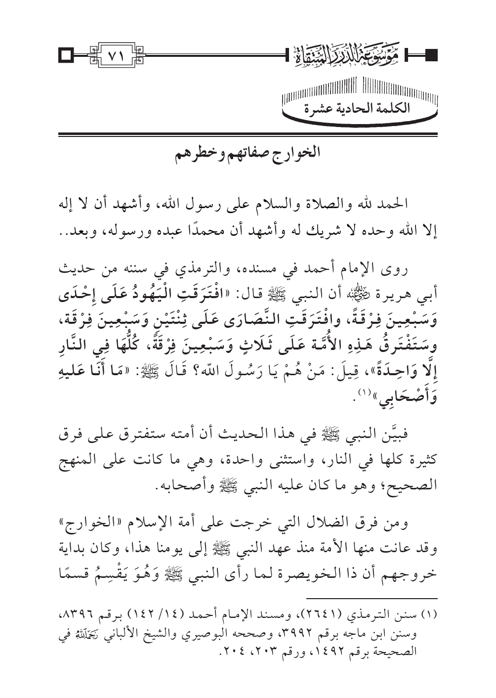 روى الإمام أحمد في مسنده، والترمذي في سننه من حديث أبي هريرة -رضي الله عنه- أن النبي -صلى الله عليه وسلم- قال: «افْتَرَقَتِ الْيَهُودُ عَلَى إِحْدَى وَسَبْعِينَ فِرْقَةً، وافْتَرَقَتِ النَّصَارَى عَلَى ثِنْتَيْنِ وَسَبْعِينَ فِرْقَة، وسَتَفْتَرقُ هَذِهِ الأُمَّة عَلَى ثَلَاثٍ وَسَبْعِينَ فِرْقَةً، كُلُّهَا فِي النَّارِ إِلَّا وَاحِدَةً»، قِيلَ: مَنْ هُمْ يَا رَسُولَ الله؟ قَالَ -صلى الله عليه وسلم-: «مَا أَنَا عَليهِ وَأَصْحَابِي» (¬١).