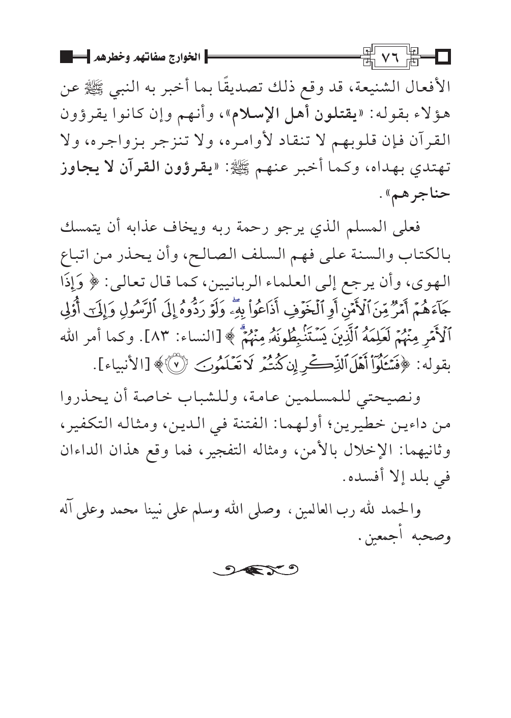 الأفعال الشنيعة، قد وقع ذلك تصديقًا بما أخبر به النبي -صلى الله عليه وسلم- عن هؤلاء بقوله: «يقتلون أهل الإسلام»، وأنهم وإن كانوا يقرؤون القرآن فإن قلوبهم لا تنقاد لأوامره، ولا تنزجر بزواجره، ولا تهتدي بهداه، وكما أخبر عنهم -صلى الله عليه وسلم-: «يقرؤون القرآن لا يجاوز حناجرهم».