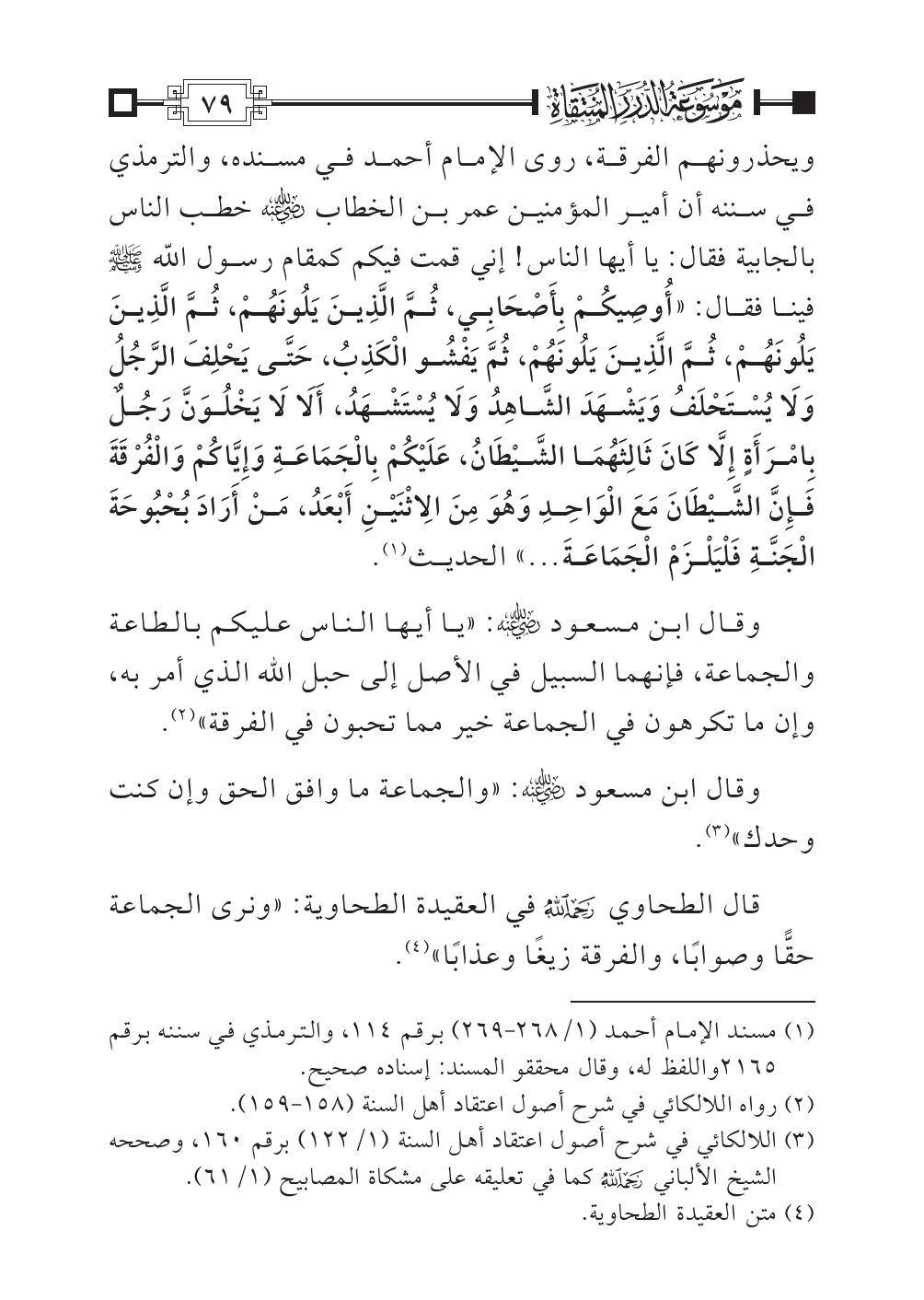 قال الطحاوي -رحمه الله- في العقيدة الطحاوية: «ونرى الجماعة حقًّا وصوابًا، والفرقة زيغًا وعذابًا» (¬٤).