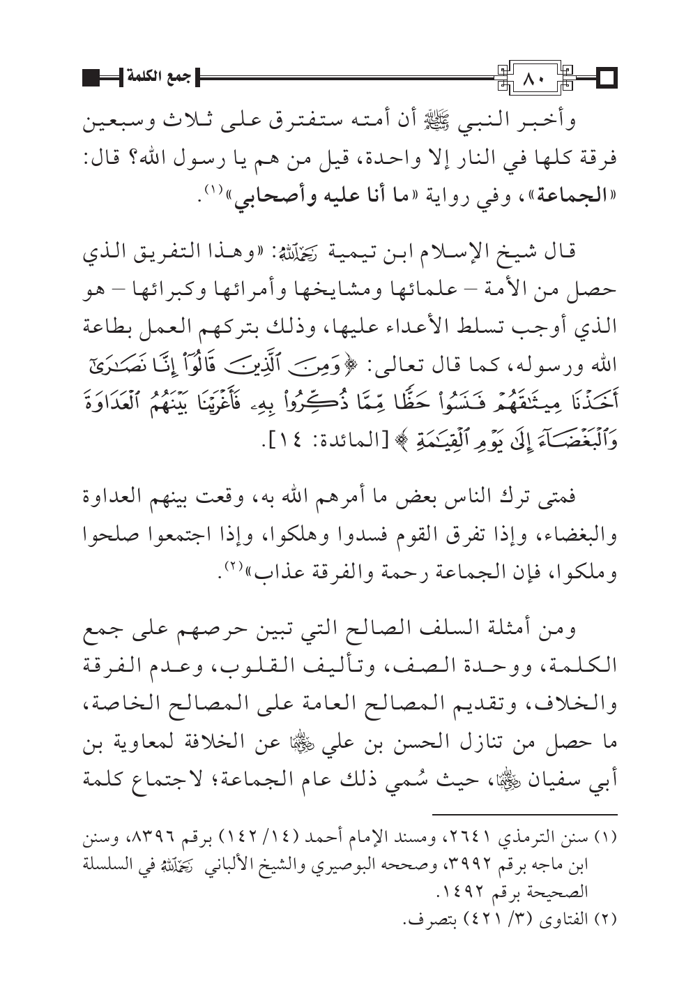 وأخبر النبي -صلى الله عليه وسلم- أن أمته ستفترق على ثلاث وسبعين فرقة كلها في النار إلا واحدة، قيل من هم يا رسول الله؟ قال: «الجماعة»، وفي رواية «ما أنا عليه وأصحابي» (¬١).