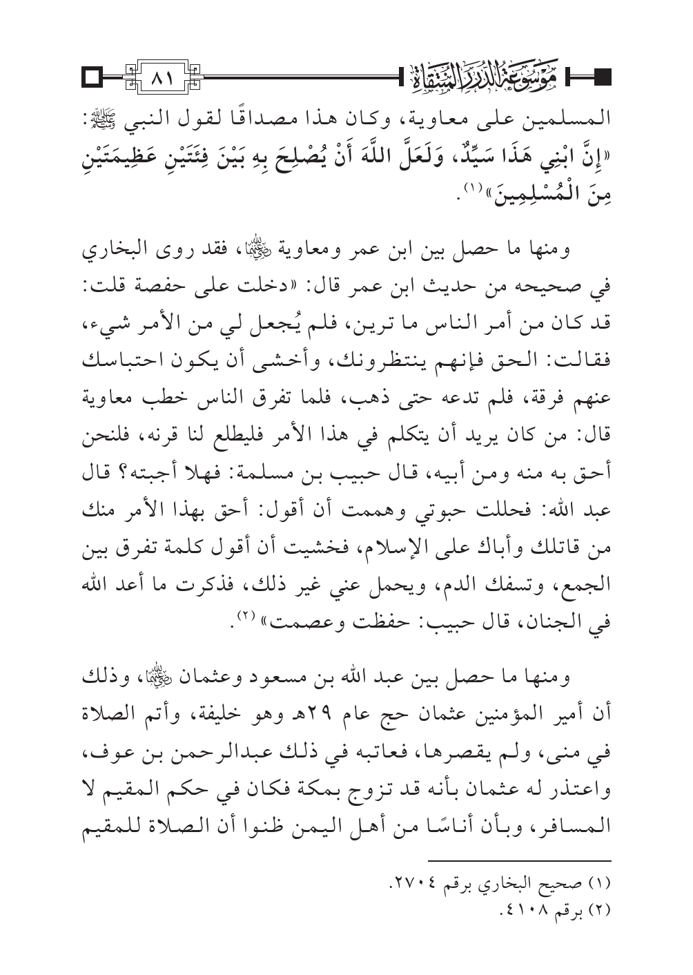 ومنها ما حصل بين ابن عمر ومعاوية -رضي الله عنهما-، فقد روى البخاري في صحيحه من حديث ابن عمر قال: «دخلت على حفصة قلت: قد كان من أمر الناس ما ترين، فلم يُجعل لي من الأمر شيء، فقالت: الحق فإنهم ينتظرونك، وأخشى أن يكون احتباسك عنهم فرقة، فلم تدعه حتى ذهب، فلما تفرق الناس خطب معاوية قال: من كان يريد أن يتكلم في هذا الأمر فليطلع لنا قرنه، فلنحن أحق به منه ومن أبيه، قال حبيب بن مسلمة: فهلا أجبته؟ قال عبد الله: فحللت حبوتي وهممت أن أقول: أحق بهذا الأمر منك من قاتلك وأباك على الإسلام، فخشيت أن أقول كلمة تفرق بين الجمع، وتسفك الدم، ويحمل عني غير ذلك، فذكرت ما أعد الله في الجنان، قال حبيب: حفظت وعصمت» (¬٢).