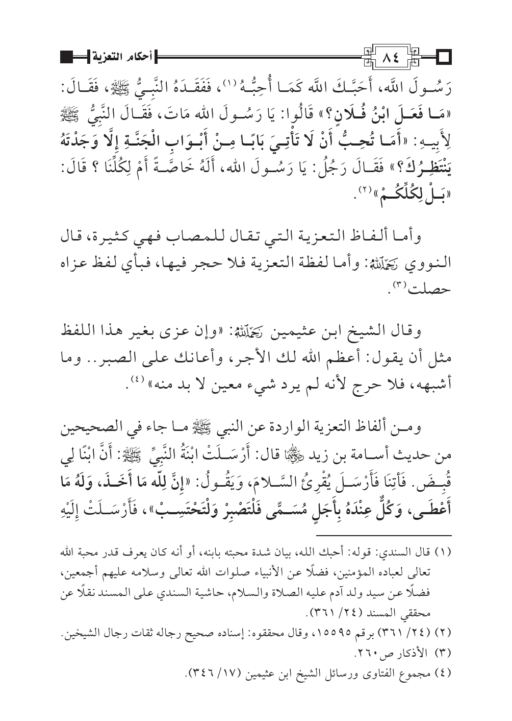 ومن ألفاظ التعزية الواردة عن النبي -صلى الله عليه وسلم- ما جاء في الصحيحين من حديث أسامة بن زيد -رضي الله عنهما- قال: أَرْسَلَتْ ابْنَةُ النَّبِيِّ - صلى الله عليه وسلم -: أَنَّ ابْنًا لِي قُبِضَ. فَأتِنَا فَأَرْسَلَ يُقْرِئُ السَّلامَ، وَيَقُولُ: «إِنَّ لِلّه مَا أَخَذَ، وَلَهُ مَا أَعْطَى، وَكُلٌّ عِنْدَهُ بِأَجَلٍ مُسَمًّى فَلْتَصْبِرْ وَلْتَحْتَسِبْ»، فَأَرْسَلَتْ إِلَيْهِ