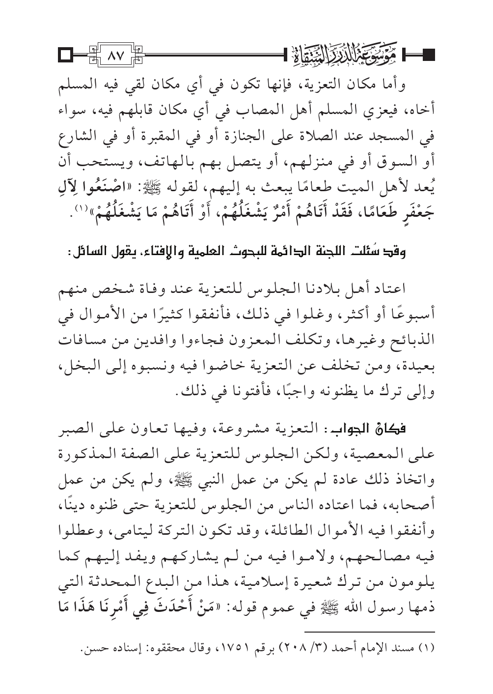 وأما مكان التعزية، فإنها تكون في أي مكان لقي فيه المسلم أخاه، فيعزي المسلم أهل المصاب في أي مكان قابلهم فيه، سواء في المسجد عند الصلاة على الجنازة أو في المقبرة أو في الشارع أو السوق أو في منزلهم، أو يتصل بهم بالهاتف، ويستحب أن يُعد لأهل الميت طعامًا يبعث به إليهم، لقوله -صلى الله عليه وسلم-: «اصْنَعُوا لِآلِ جَعْفَرٍ طَعَامًا، فَقَدْ أَتَاهُمْ أَمْرٌ يَشْغَلُهُمْ، أَوْ أَتَاهُمْ مَا يَشْغَلُهُمْ» (¬١).