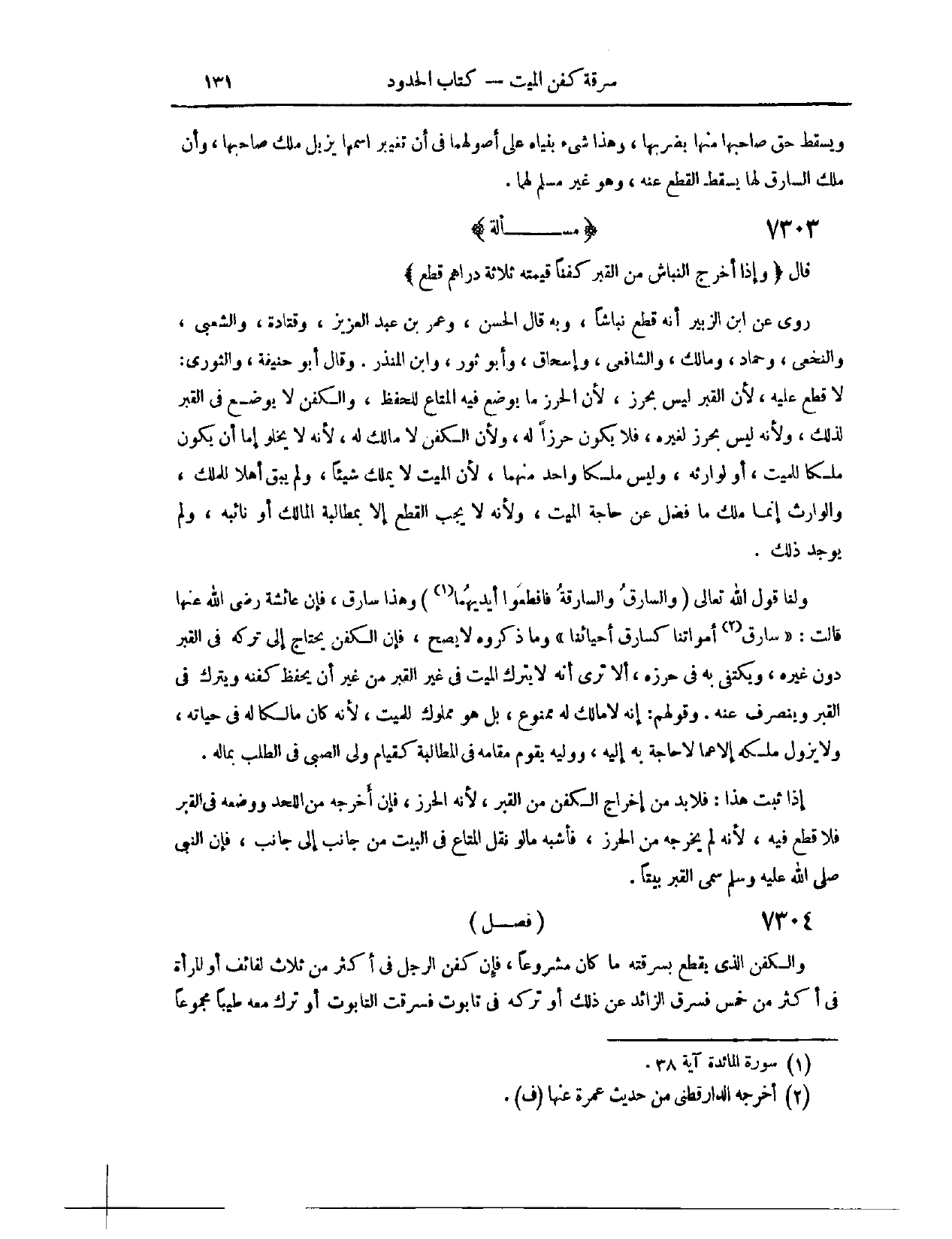 (٧٢٩٥) مَسْأَلَةٌ؛ قَالَ: (وَإِذَا أَخْرَجَ النَّبَّاشُ مِنْ الْقَبْرِ كَفَنًا قِيمَتُهُ ثَلَاثَةُ دَرَاهِمَ قُطِعَ) رُوِيَ عَنْ ابْنِ الزُّبَيْرِ أَنَّهُ قَطَعَ نَبَّاشًا. وَبِهِ قَالَ الْحَسَنُ، وَعُمَرُ بْنُ عَبْدِ الْعَزِيزِ، وَقَتَادَةُ، وَالشَّعْبِيُّ، وَالنَّخَعِيُّ، وَحَمَّادٌ، وَمَالِكٌ، وَالشَّافِعِيُّ، وَإِسْحَاقُ، وَأَبُو ثَوْرٍ، وَابْنُ الْمُنْذِرِ. وَقَالَ أَبُو حَنِيفَةَ، وَالثَّوْرِيُّ: لَا قَطْعَ عَلَيْهِ؛ لِأَنَّ الْقَبْرَ لَيْسَ بِحِرْزٍ؛ لِأَنَّ الْحِرْزَ مَا يُوضَعُ فِيهِ الْمَتَاعُ لِلْحِفْظِ، وَالْكَفَنُ لَا يُوضَعُ فِي الْقَبْرِ لِذَلِكَ؛ وَلِأَنَّهُ لَيْسَ بِحِرْزٍ لِغَيْرِهِ، فَلَا يَكُونُ حِرْزًا لَهُ، وَلِأَنَّ الْكَفَنَ لَا مَالِكَ لَهُ؛ لِأَنَّهُ لَا يَخْلُو إمَّا أَنْ يَكُونَ مِلْكًا لِلْمَيِّتِ أَوْ لِوَارِثِهِ، وَلَيْسَ مِلْكًا لِوَاحِدٍ مِنْهُمَا؛ لِأَنَّ الْمَيِّتَ لَا يَمْلِكُ شَيْئًا، وَلَمْ يَبْقَ أَهْلًا لِلْمِلْكِ، وَالْوَارِثُ إنَّمَا مَلَكَ مَا فَضَلَ عَنْ حَاجَةِ الْمَيِّتِ؛ وَلِأَنَّهُ لَا يَجِبُ الْقَطْعُ إلَّا بِمُطَالَبَةِ الْمَالِكِ أَوْ نَائِبِهِ، وَلَمْ يُوجَدْ ذَلِكَ.