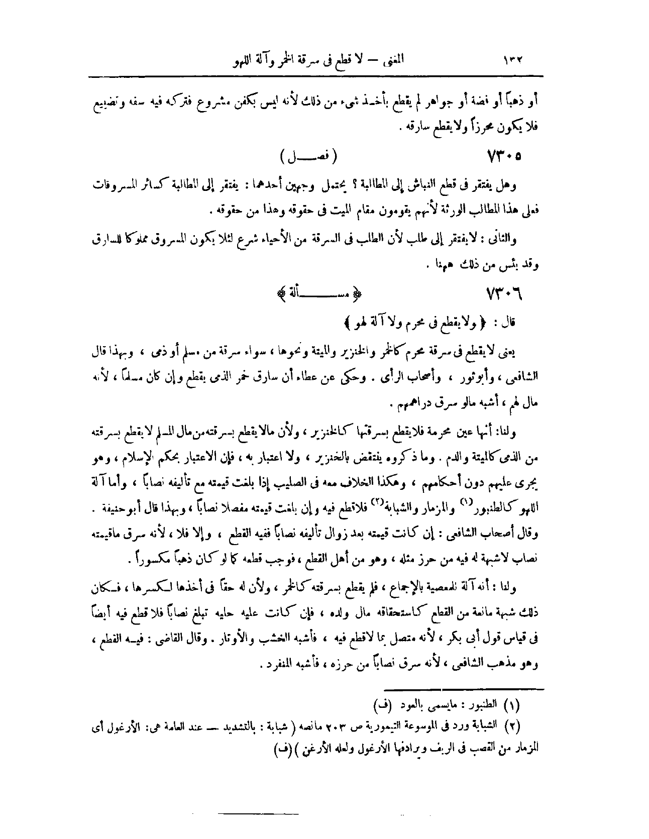 [مَسْأَلَةٌ الْقَطْعُ فِي سَرِقَةِ الْمُحَرَّمِ أَوْ آلَةِ اللَّهْوِ]