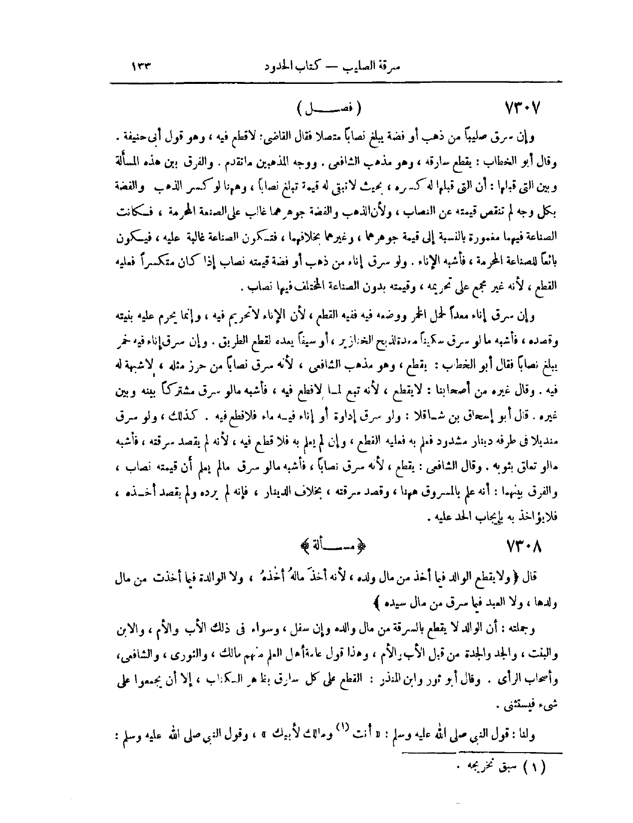 (٧٢٩٩) فَصْلٌ: وَإِنْ سَرَقَ صَلِيبًا مِنْ ذَهَبٍ أَوْ فِضَّةٍ، يَبْلُغُ نِصَابًا مُتَّصِلًا، فَقَالَ الْقَاضِي: لَا قَطْعَ فِيهِ. وَهُوَ قَوْلُ أَبِي حَنِيفَةَ. وَقَالَ أَبُو الْخَطَّابِ: يُقْطَعُ سَارِقُهُ. وَهُوَ مَذْهَبُ الشَّافِعِيِّ. وَوَجْهُ الْمَذْهَبَيْنِ مَا تَقَدَّمَ. وَالْفَرْقُ بَيْنَ هَذِهِ الْمَسْأَلَةِ وَبَيْنَ الَّتِي قَبْلَهَا، أَنَّ الَّتِي قَبْلَهَا لَهُ كَسْرُهُ بِحَيْثُ لَا تَبْقَى لَهُ قِيمَةٌ تَبْلُغُ نِصَابًا، وَهَا هُنَا لَوْ كُسِرَ الذَّهَبُ وَالْفِضَّةُ بِكُلِّ وَجْهٍ لَمْ تَنْقُصْ قِيمَتُهُ عَنْ النِّصَابِ؛ وَلِأَنَّ الذَّهَبَ وَالْفِضَّةَ جَوْهَرُهُمَا غَالِبٌ عَلَى الصَّنْعَةِ الْمُحَرَّمَةِ، فَكَانَتْ الصِّنَاعَةُ فِيهِمَا مَغْمُورَةً بِالنِّسْبَةِ إلَى قِيمَةِ جَوْهَرِهِمَا، وَغَيْرُهُمَا بِخِلَافِهِمَا، فَتَكُونُ الصِّنَاعَةُ غَالِبَةً عَلَيْهِ، فَيَكُونُ تَابِعًا لِلصِّنَاعَةِ الْمُحَرَّمَةِ، فَأَشْبَهَ الْإِنَاءَ.