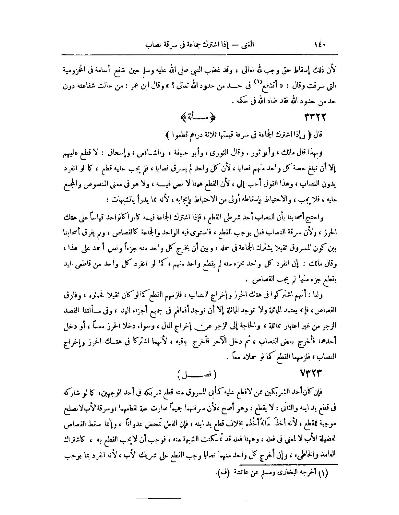 (٧٣١٤) مَسْأَلَةٌ؛ قَالَ: (وَإِذَا اشْتَرَكَ الْجَمَاعَةُ فِي سَرِقَةٍ قِيمَتُهَا ثَلَاثَةُ دَرَاهِمَ، قُطِعُوا) وَبِهَذَا قَالَ مَالِكٌ، وَأَبُو ثَوْرٍ. وَقَالَ الثَّوْرِيُّ، وَأَبُو حَنِيفَةَ، وَالشَّافِعِيُّ، وَإِسْحَاقُ: لَا قَطْعَ عَلَيْهِمْ إلَّا أَنْ تَبْلُغَ حِصَّةُ كُلِّ وَاحِدٍ مِنْهُمْ نِصَابًا؛ لِأَنَّ كُلَّ وَاحِدٍ لَمْ يَسْرِقْ نِصَابًا، فَلَمْ يَجِبْ عَلَيْهِ قَطْعٌ، كَمَا لَوْ انْفَرَدَ بِدُونِ النِّصَابِ. وَهَذَا الْقَوْلُ أَحَبُّ إلَيَّ؛ لِأَنَّ الْقَطْعَ هَاهُنَا لَا نَصَّ فِيهِ، وَلَا هُوَ فِي مَعْنَى الْمَنْصُوصِ وَالْمُجْمَعِ عَلَيْهِ، فَلَا يَجِبُ، وَالِاحْتِيَاطُ بِإِسْقَاطِهِ أَوْلَى مِنْ الِاحْتِيَاطِ بِإِيجَابِهِ؛ لِأَنَّهُ مِمَّا يُدْرَأُ بِالشُّبُهَاتِ وَاحْتَجَّ أَصْحَابُنَا بِأَنَّ النِّصَابَ أَحَدُ شَرْطَيْ الْقَطْعِ، فَإِذَا اشْتَرَكَ الْجَمَاعَةُ فِيهِ كَانُوا كَالْوَاحِدِ، قِيَاسًا عَلَى هَتْكِ الْحِرْزِ؛ وَلِأَنَّ سَرِقَةَ النِّصَابِ فِعْلٌ يُوجِبُ الْقَطْعَ، فَاسْتَوَى فِيهِ الْوَاحِدُ وَالْجَمَاعَةُ، كَالْقِصَاصِ، وَلَمْ يُفَرِّقْ أَصْحَابُنَا بَيْنَ كَوْنِ الْمَسْرُوقِ ثَقِيلًا يَشْتَرِكُ الْجَمَاعَةُ فِي حَمْلِهِ، وَبَيْنَ أَنْ يُخْرِجَ كُلُّ وَاحِدٍ مِنْهُ جُزْءًا، وَنَصَّ أَحْمَدُ عَلَى هَذَا.