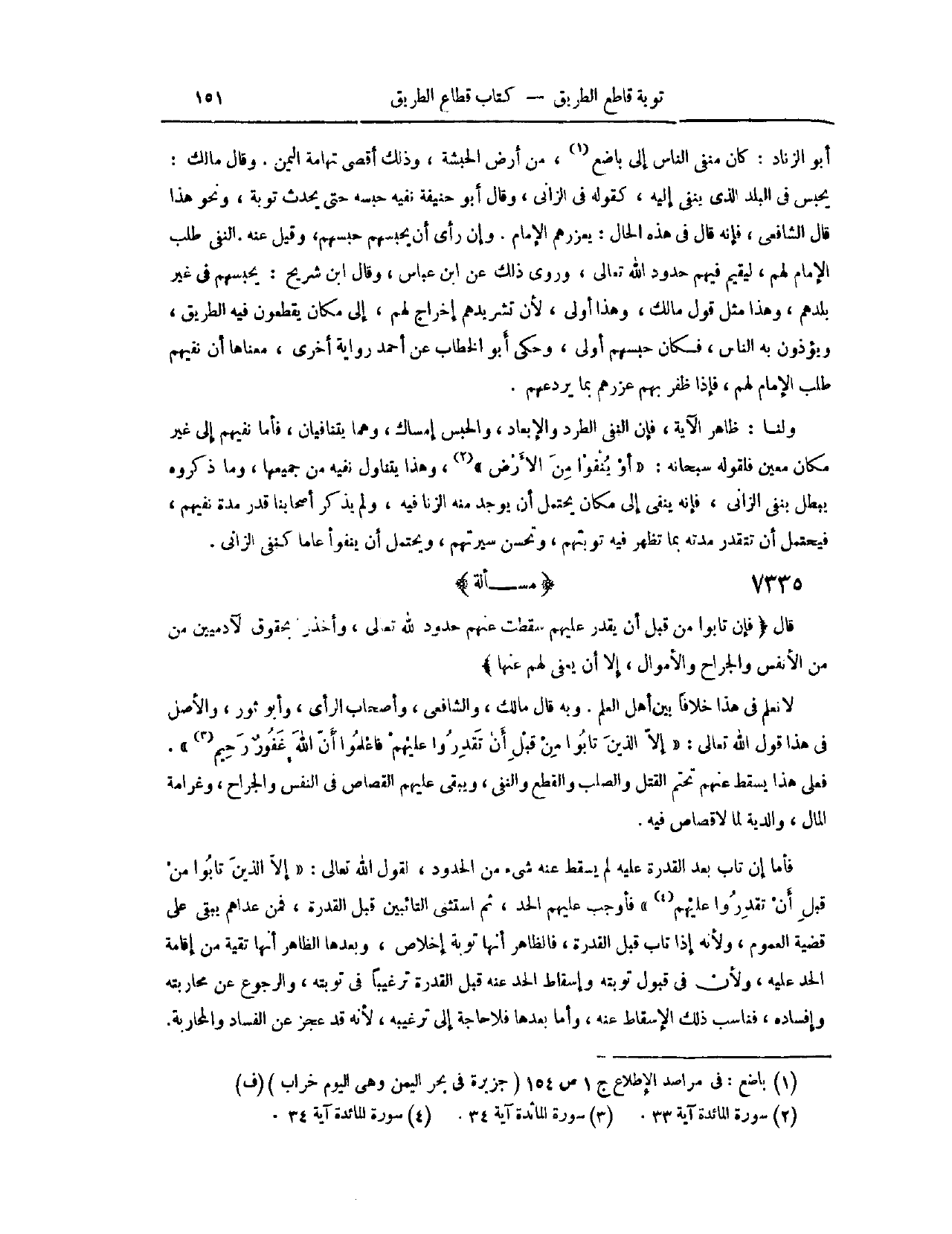 (٧٣٢٧) مَسْأَلَةٌ؛ قَالَ: (فَإِنْ تَابُوا مِنْ قَبْلِ أَنْ يُقْدَرَ عَلَيْهِمْ، سَقَطَتْ عَنْهُمْ حُدُودُ اللَّهِ تَعَالَى، وَأُخِذُوا بِحُقُوقِ الْآدَمِيِّينَ؛ مِنْ الْأَنْفُسِ، وَالْجِرَاحِ، وَالْأَمْوَالِ، إلَّا أَنْ يُعْفَى لَهُمْ عَنْهَا) لَا نَعْلَمُ فِي هَذَا خِلَافًا بَيْنَ أَهْلِ الْعِلْمِ. وَبِهِ قَالَ مَالِكٌ، وَالشَّافِعِيُّ، وَأَصْحَابُ الرَّأْيِ وَأَبُو ثَوْرٍ. وَالْأَصْلُ فِي هَذَا قَوْلُ اللَّهِ تَعَالَى: {إِلا الَّذِينَ تَابُوا مِنْ قَبْلِ أَنْ تَقْدِرُوا عَلَيْهِمْ فَاعْلَمُوا أَنَّ اللَّهَ غَفُورٌ رَحِيمٌ} [المائدة: ٣٤] . فَعَلَى هَذَا يَسْقُطُ عَنْهُمْ تَحَتُّمُ الْقَتْلِ وَالصَّلْبِ، وَالْقَطْعِ وَالنَّفْيِ، وَيَبْقَى عَلَيْهِمْ الْقِصَاصُ فِي النَّفْسِ وَالْجِرَاحِ، وَغَرَامَةُ الْمَالِ وَالدِّيَةُ لِمَا لَا قِصَاصَ فِيهِ.