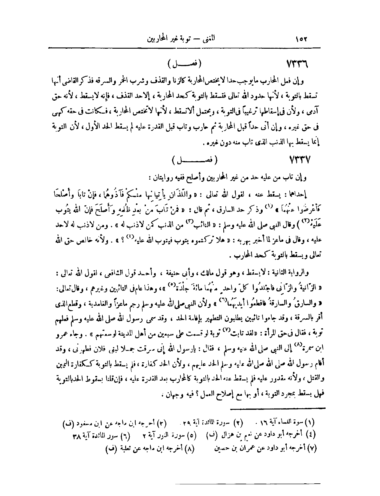 (٧٣٢٩) فَصْلٌ: وَإِنْ تَابَ مَنْ عَلَيْهِ حَدٌّ مِنْ غَيْرِ الْمُحَارِبِينَ، وَأَصْلَحَ، فَفِيهِ رِوَايَتَانِ؛ إحْدَاهُمَا: يَسْقُطُ عَنْهُ؛ لِقَوْلِ اللَّهِ تَعَالَى: {وَاللَّذَانِ يَأْتِيَانِهَا مِنْكُمْ فَآذُوهُمَا فَإِنْ تَابَا وَأَصْلَحَا فَأَعْرِضُوا عَنْهُمَا} [النساء: ١٦] . وَذَكَرَ حَدَّ السَّارِقِ، ثُمَّ قَالَ: {فَمَنْ تَابَ مِنْ بَعْدِ ظُلْمِهِ وَأَصْلَحَ فَإِنَّ اللَّهَ يَتُوبُ عَلَيْهِ} [المائدة: ٣٩] . وَقَالَ النَّبِيُّ - صَلَّى اللَّهُ عَلَيْهِ وَسَلَّمَ -: «التَّائِبُ مِنْ الذَّنْبِ، كَمَنْ لَا ذَنْبَ لَهُ» . وَمَنْ لَا ذَنْبَ لَهُ لَا حَدَّ عَلَيْهِ.