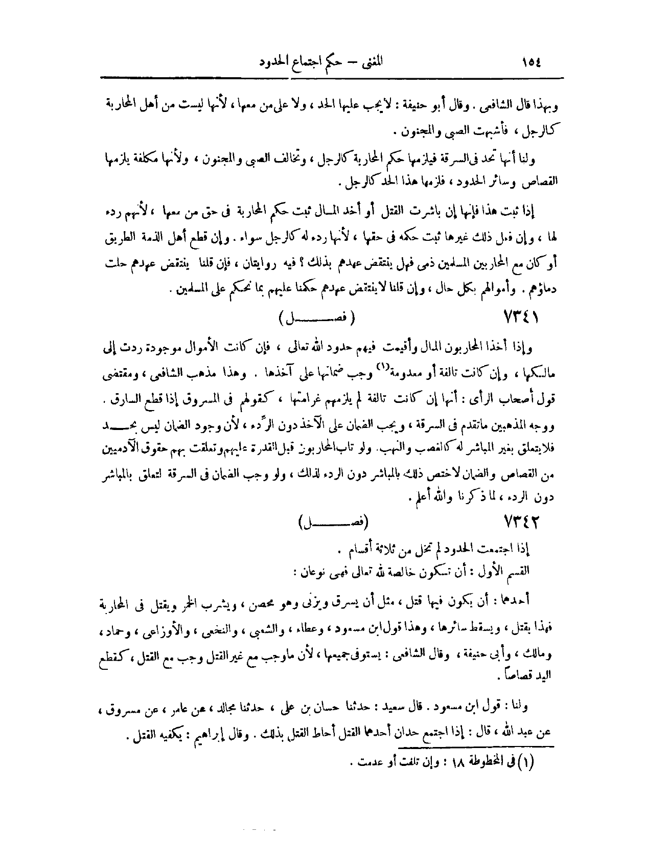 (٧٣٣٤) فَصْلٌ: إذَا اجْتَمَعَتْ الْحُدُودُ، لَمْ تَخْلُ مِنْ ثَلَاثَةِ أَقْسَامٍ؛ الْقِسَمُ الْأَوَّلُ: أَنْ تَكُونَ خَالِصَةً لِلَّهِ تَعَالَى، فَهِيَ نَوْعَانِ؛ أَحَدُهُمَا: أَنْ يَكُونَ فِيهَا قَتْلٌ، مِثْلَ أَنْ يَسْرِقَ، وَيَزْنِيَ وَهُوَ مُحْصَنٌ، وَيَشْرَبَ الْخَمْرَ، وَيَقْتُلَ فِي الْمُحَارَبَةِ، فَهَذَا يُقْتَلُ، وَيَسْقُطُ سَائِرُهَا. وَهَذَا قَوْلُ ابْنِ مَسْعُودٍ، وَعَطَاءٍ، وَالشَّعْبِيِّ، وَالنَّخَعِيِّ، وَالْأَوْزَاعِيِّ، وَحَمَّادٍ، وَمَالِكٍ، وَأَبِي حَنِيفَةَ. وَقَالَ الشَّافِعِيُّ: يُسْتَوْفَى جَمِيعُهَا؛ لِأَنَّ مَا وَجَبَ مَعَ غَيْرِ الْقَتْلِ، وَجَبَ مَعَ الْقَتْلِ، كَقَطْعِ الْيَدِ قِصَاصًا.