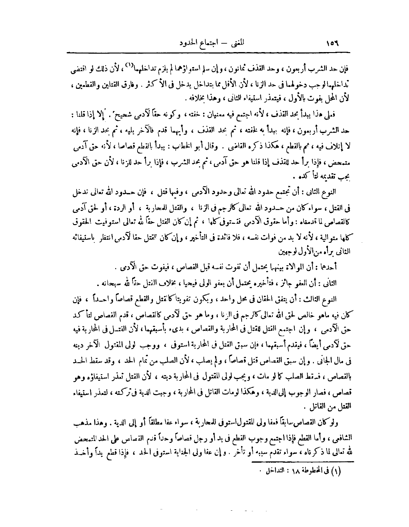 وَقَالَ أَبُو الْخَطَّابِ: يُبْدَأُ بِالْقَطْعِ قِصَاصًا؛ لِأَنَّهُ حَقُّ آدَمِيٍّ مُتَمَحِّضٌ، فَإِذَا بَرِئَ حُدَّ لِلْقَذْفِ، إذَا قُلْنَا: هُوَ حَقُّ آدَمِيٍّ ثُمَّ يُحَدُّ لِلشُّرْبِ فَإِذَا بَرِئَ، حُدَّ لِلزِّنَا؛ لِأَنَّ حَقَّ الْآدَمِيِّ يَجِبُ تَقْدِيمُهُ لِتَأَكُّدِهِ. النَّوْعُ الثَّانِي: أَنْ تَجْتَمِعَ حُدُودٌ لِلَّهِ تَعَالَى وَحُدُودٌ لِآدَمِيٍّ، وَفِيهَا قَتْلٌ فَإِنَّ حُدُودَ اللَّهِ تَعَالَى تَدْخُلُ فِي الْقَتْلِ، سَوَاءٌ كَانَ مِنْ حُدُودِ اللَّهِ تَعَالَى، كَالرَّجْمِ فِي الزِّنَا، وَالْقَتْلِ لِلْمُحَارَبَةِ، أَوْ الرِّدَّةِ أَوْ لِحَقِّ آدَمِيٍّ، كَالْقِصَاصِ؛ لِمَا قَدَّمْنَاهُ. وَأَمَّا حُقُوقُ الْآدَمِيِّ، فَتُسْتَوْفَى كُلُّهَا. ثُمَّ إنْ كَانَ الْقَتْلُ حَقًّا لِلَّهِ تَعَالَى، اُسْتُوْفِيَتْ الْحُقُوقُ كُلُّهَا مُتَوَالِيَةً؛ لِأَنَّهُ لَا بُدَّ مِنْ فَوَاتِ نَفْسِهِ، فَلَا فَائِدَةَ فِي التَّأْخِيرِ، وَإِنْ كَانَ الْقَتْلُ حَقًّا لِآدَمِيٍّ، اُنْتُظِرَ بِاسْتِيفَائِهِ الثَّانِي بُرْؤُهُ مِنْ الْأَوَّلِ لِوَجْهَيْنِ؛ أَحَدُهُمَا: أَنَّ الْمُوَالَاةَ بَيْنَهُمَا يُحْتَمَلُ أَنْ تُفَوِّتَ نَفْسَهُ قَبْلَ الْقِصَاصِ، فَيَفُوتَ حَقُّ الْآدَمِيِّ. وَالثَّانِي: أَنَّ الْعَفْوَ جَائِزٌ، فَتَأْخِيرُهُ يَحْتَمِلُ أَنْ يَعْفُوَ الْوَلِيُّ فَيَحْيَا، بِخِلَافِ الْقَتْلِ حَقًّا لِلَّهِ سُبْحَانَهُ. النَّوْعُ الثَّالِثُ: أَنْ يَتَّفِقَ الْحَقَّانِ فِي مَحَلٍّ وَاحِدٍ، وَيَكُونَ تَفْوِيتًا، كَالْقَتْلِ وَالْقَطْعِ قِصَاصًا وَحَدًّا؛ فَإِنْ كَانَ فِيهِ مَا هُوَ خَالِصٌ لِحَقِّ اللَّهِ تَعَالَى، كَالرَّجْمِ فِي الزِّنَا، وَمَا هُوَ حَقٌّ لِآدَمِيٍّ، كَالْقِصَاصِ، قُدِّمَ الْقِصَاصُ، لِتَأَكُّدِ حَقِّ الْآدَمِيِّ.
