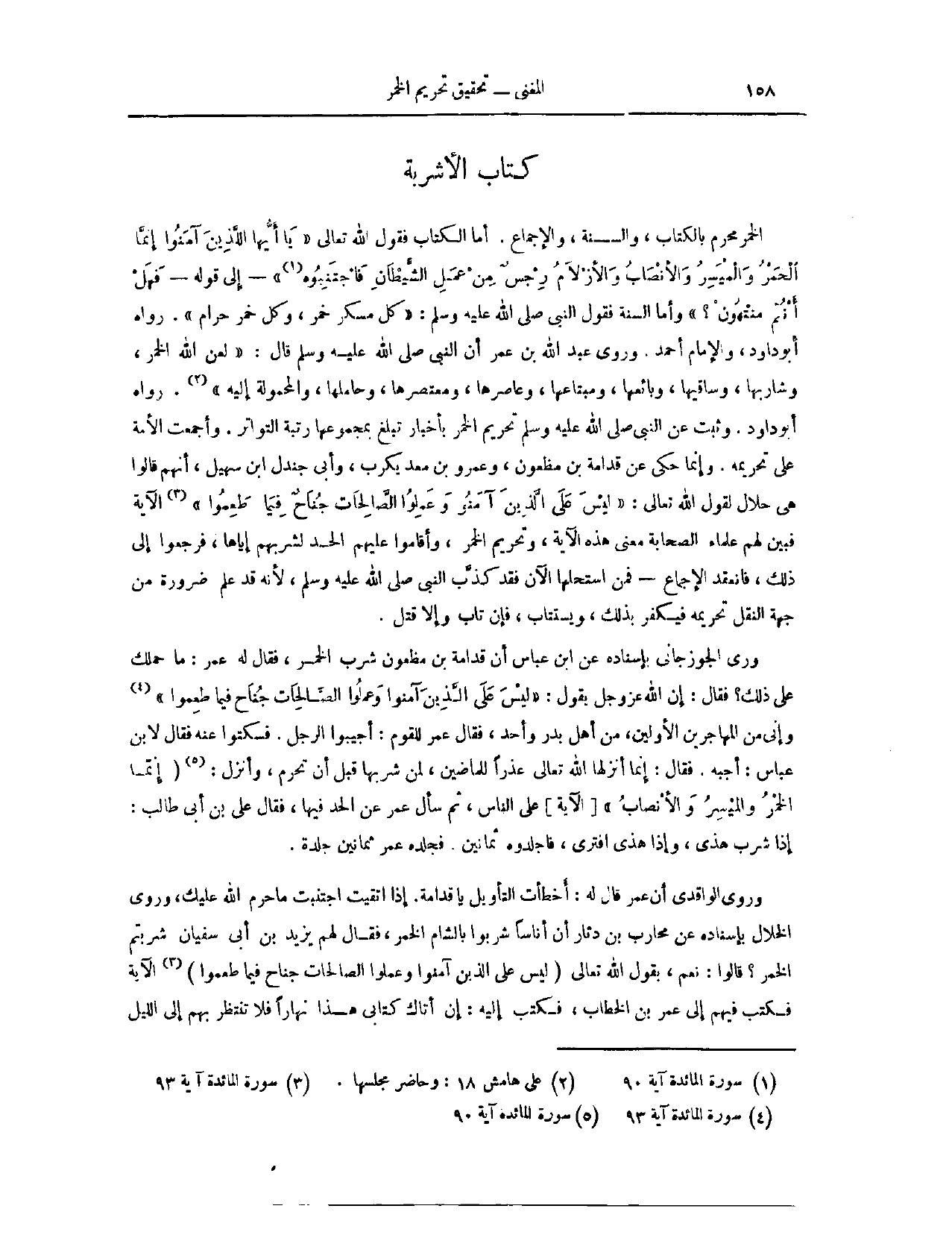 رَوَى الْجُوزَجَانِيُّ، بِإِسْنَادِهِ عَنْ ابْنِ عَبَّاسٍ، أَنَّ قُدَامَةَ بْنَ مَظْعُونٍ شَرِبَ الْخَمْرَ، فَقَالَ لَهُ عُمَرُ: مَا حَمَلَك عَلَى ذَلِكَ؟ فَقَالَ: إنَّ اللَّهَ عَزَّ وَجَلَّ يَقُولُ: {لَيْسَ عَلَى الَّذِينَ آمَنُوا وَعَمِلُوا الصَّالِحَاتِ جُنَاحٌ فِيمَا طَعِمُوا} [المائدة: ٩٣] . وَإِنِّي مِنْ الْمُهَاجِرِينَ الْأَوَّلِينَ مِنْ أَهْلِ بَدْرٍ وَأُحُدٍ. فَقَالَ عُمَرُ لِلْقَوْمِ: أَجِيبُوا الرَّجُلَ. فَسَكَتُوا عَنْهُ، فَقَالَ لِابْنِ عَبَّاسٍ: أَجِبْهُ. فَقَالَ: إنَّمَا أَنْزَلَهَا اللَّهُ تَعَالَى عُذْرًا لِلْمَاضِينَ، لِمَنْ شَرِبَهَا قَبْلَ أَنْ تُحَرَّمَ وَأَنْزَلَ: {إِنَّمَا الْخَمْرُ وَالْمَيْسِرُ وَالأَنْصَابُ} [المائدة: ٩٠] . حُجَّةً عَلَى النَّاسِ. ثُمَّ سَأَلَ عُمَرُ عَنْ الْحَدِّ فِيهَا فَقَالَ عَلِيُّ بْنُ أَبِي طَالِبٍ: إذَا شَرِبَ هَذَى، وَإِذَا هَذَى افْتَرَى فَاجْلِدُوهُ ثَمَانِينَ، فَجَلَدَهُ عُمَرُ ثَمَانِينَ جَلْدَةً. وَرَوَى الْوَاقِدِيُّ أَنَّ عُمَرَ قَالَ لَهُ: أَخْطَأْت التَّأْوِيلَ يَا قُدَامَةَ، إذَا اتَّقَيْت اجْتَنَبْت مَا حَرَّمَ اللَّهُ عَلَيْك.