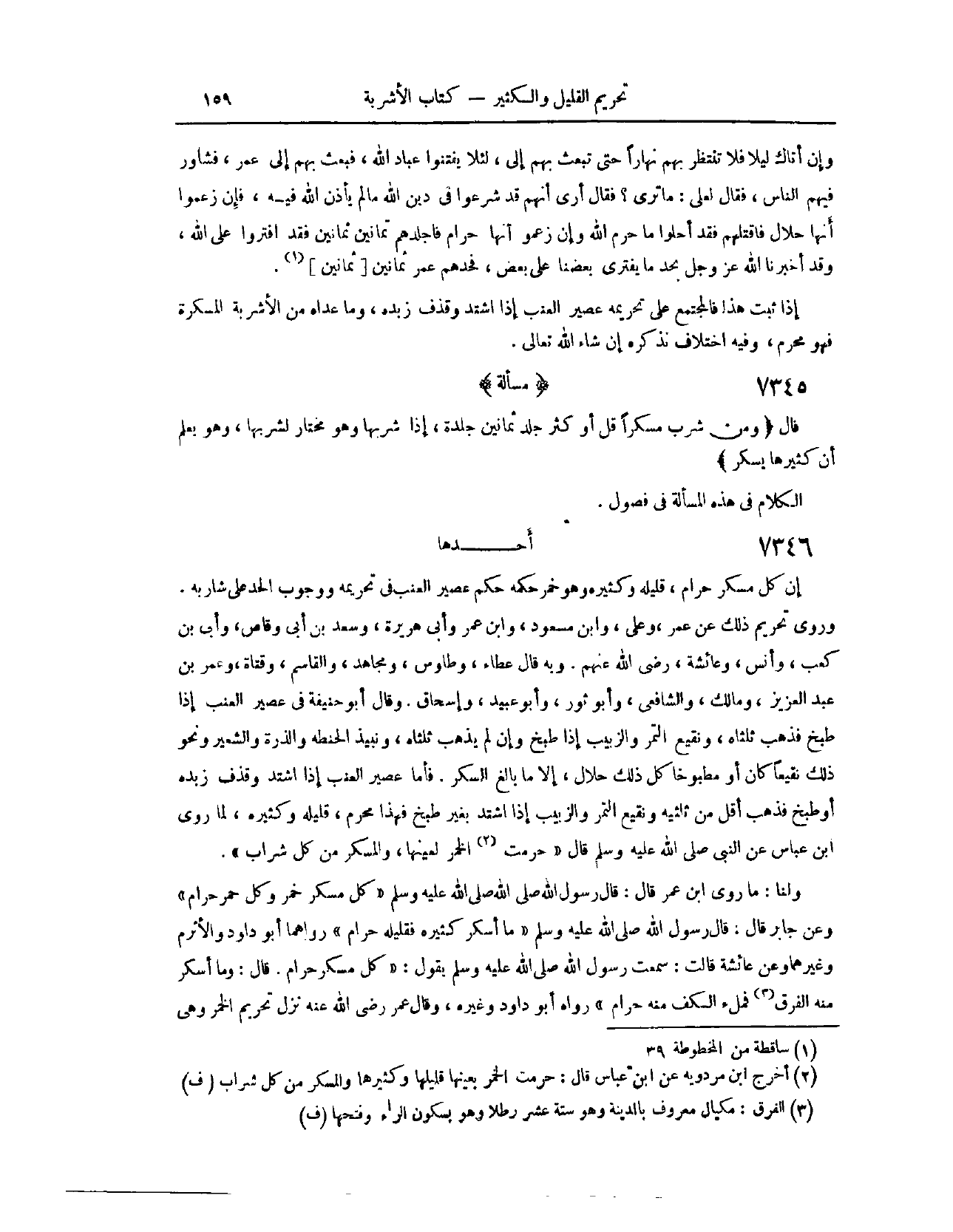 وَإِنْ أَتَاكَ لَيْلًا، فَلَا تَنْتَظِرْ بِهِمْ نَهَارًا، حَتَّى تَبْعَثَ بِهِمْ إلَيَّ، لِئَلَّا يَفْتِنُوا عِبَادَ اللَّهِ. فَبَعَثَ بِهِمْ إلَى عُمَرَ، فَشَاوَرَ فِيهِمْ النَّاسَ، فَقَالَ لِعَلِيٍّ: مَا تَرَى؟ فَقَالَ: أَرَى أَنَّهُمْ قَدْ شَرَّعُوا فِي دِينِ اللَّهِ مَا لَمْ يَأْذَنْ اللَّهُ فِيهِ، فَإِنْ زَعَمُوا أَنَّهَا حَلَالٌ، فَاقْتُلْهُمْ، فَقَدْ أَحَلُّوا مَا حَرَّمَ اللَّهُ، وَإِنْ زَعَمُوا أَنَّهَا حَرَامٌ، فَاجْلِدُوهُمْ ثَمَانِينَ ثَمَانِينَ، فَقَدْ افْتَرَوْا عَلَى اللَّهِ. وَقَدْ أَخْبَرَنَا اللَّهُ عَزَّ وَجَلَّ بِحَدِّ مَا يَفْتَرِي بَعْضُنَا عَلَى بَعْضٍ.: فَحَدَّهُمْ عُمَرُ ثَمَانِينَ ثَمَانِينَ إذَا ثَبَتَ هَذَا، فَالْمُجْمَعُ عَلَى تَحْرِيمِهِ عَصِيرُ الْعِنَبِ، إذَا اشْتَدَّ وَقَذَفَ زَبَدَهُ، وَمَا عَدَاهُ مِنْ الْأَشْرِبَةِ الْمُسْكِرَةِ، فَهُوَ مُحَرَّمٌ، وَفِيهِ اخْتِلَافٌ نَذْكُرُهُ - إنْ شَاءَ اللَّهُ تَعَالَى - (٧٣٣٧)